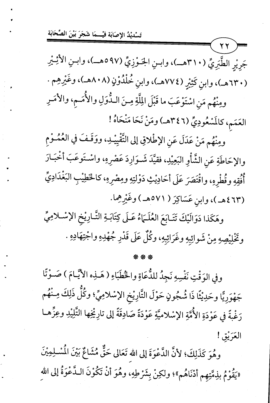 وهَكَذا دَوَالَيْكَ تَتَابَعَ العُلَمَاءُ عَلَى كِتَابَةِ التَّارِيْخِ الإسْلامِيِّ وتَخْلِيْصِهِ مِنْ شَوائِبِهِ وغَرَائِبِهِ، وكُلٌ عَلَى قَدْرِ جُهْدِهِ واجْتِهَادِهِ.