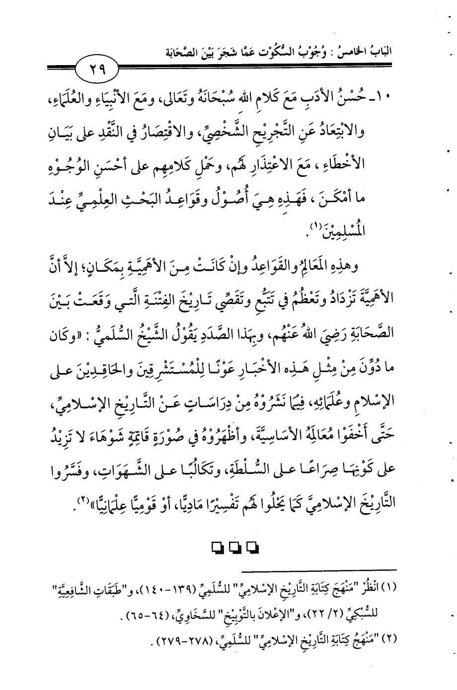 وهذِهِ المَعَالِمُ والقَوَاعِدُ وإنْ كَانَتْ مِنَ الأهَمِيَّةِ بِمَكَانٍ؛ إلاَّ أنَّ الأهَمِيَّةَ تَزْدَادُ وتَعْظُمُ في تَتَبُّعِ وتَقَصِّي تَارِيْخَ الفِتْنَةِ الَّتي وَقَعَتْ بَيْنَ الصَّحَابَةِ رَضِيَ اللهُ عَنْهُم، وبِهَذا الصَّدَدِ يَقُوْلُ الشَّيْخُ السُّلَميُّ: «وكَان ما دُوِّنَ مِنْ مِثْلِ هَذِه الأخْبَارِ عَوْنًا لِلْمُسْتَشْرِقِينَ والحَاقِدِيْنَ على الإسْلامِ وعُلَمَائِهِ، فِيْمَا نَشَرُوْهُ مِنْ دِرَاسَاتٍ عَنْ التَّارِيْخِ الإسْلامِيِّ، حَتَّى أَخْفَوْا مُعَالِمَهُ الأسَاسِيَّةَ، وأظْهَرُوْهُ في صُوْرَةٍ قَاتِمَةٍ شَوْهَاءَ لا تَزِيْدُ على كَوْنِهَا صِرَاعًا على السُّلْطَةِ، وتَكَالُبًا على الشَّهَوَاتِ، وفَسَّرُوا التَّارِيْخَ الإسْلامِيَّ كَمَا يَحْلُوا لَهُم تَفْسِيْرًا مَادِيًّا، أوْ قَوْمِيًّا عِلْمَانِيًّا» (¬2).