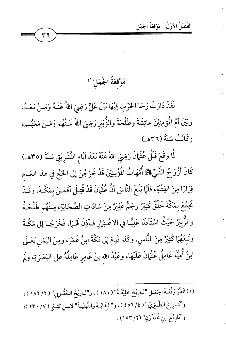 (¬1) انْظُرْ وَقْعَةَ الجَمَلِ «تَارِيْخَ خَلِيْفَةَ» (181)، و «تَارِيْخَ الطَّبَرِيِّ» (4/ 456)، و «البِدَايَةَ والنِّهايَةَ» لابنِ كَثِيْرٍ (7/ 230)، و «تَارِيْخَ ابنِ خُلْدُوْنٍ» (2/ 153).