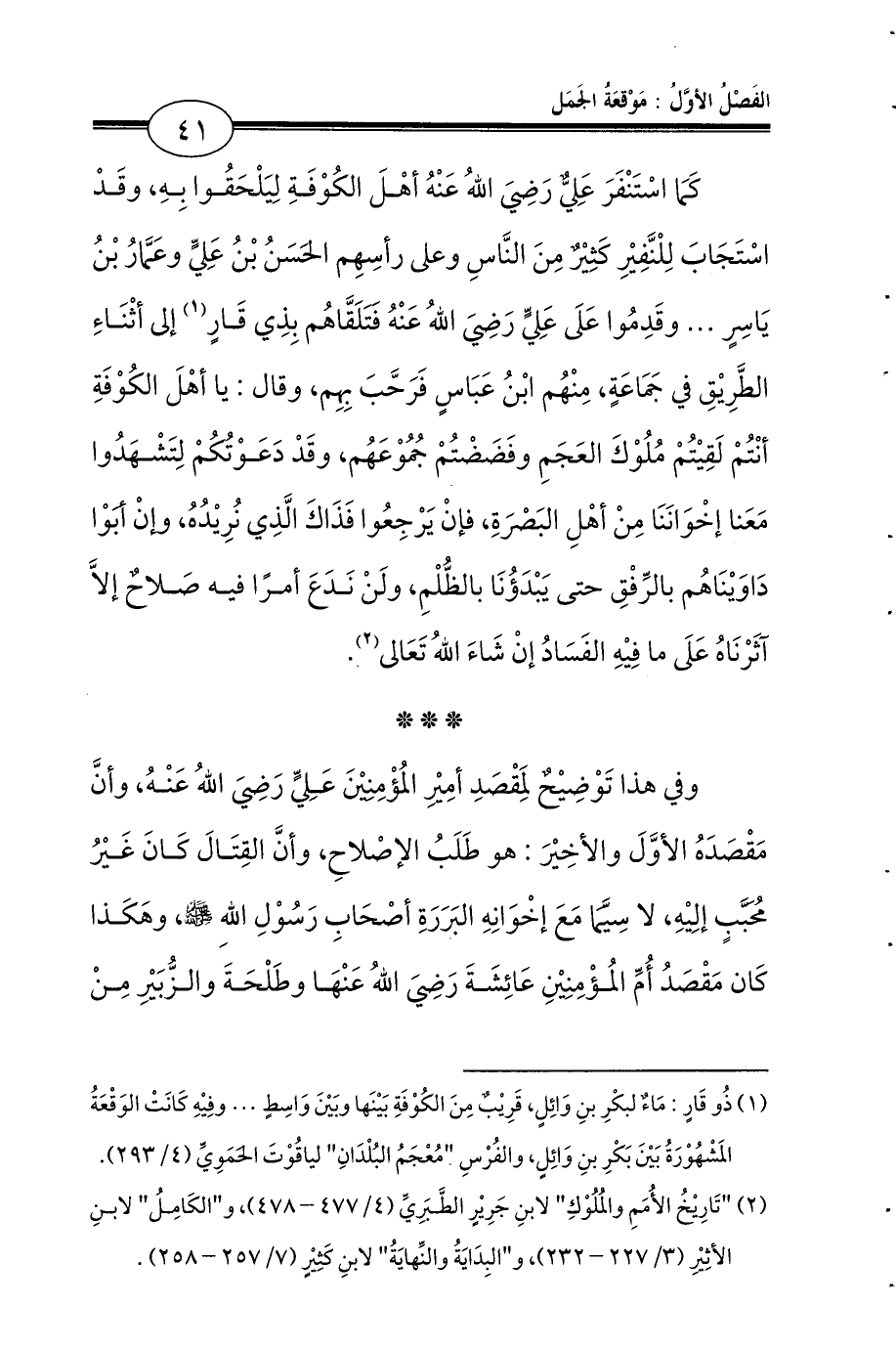 وفي هذا تَوْضِيْحٌ لِمَقْصَدِ أمِيْرِ المُؤْمِنِيْنَ عَلِيٍّ رَضِيَ اللهُ عَنْهُ، وأنَّ مَقْصَدَهُ الأوَّلَ والأخِيْرَ: هو طَلَبُ الإصْلاحِ، وأنَّ القِتَالَ كَانَ غَيْرَ مُحَبَّبٍ إلِيْهِ، لا سِيَّمَا مَعَ إخْوَانِهِ البَرَرَةِ أصْحَابِ رَسُوْلِ اللهِ - صلى الله عليه وسلم -، وهَكَذا كَان مَقْصَدُ أُمِّ المُؤْمِنِيْنِ عَائِشَةَ رَضِيَ اللهُ عَنْهَا وطَلْحَةَ والزُّبَيْرِ مِنْ