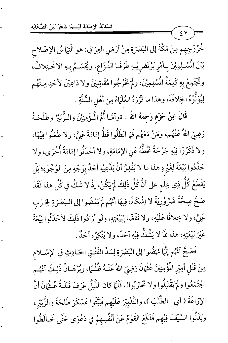 قَالَ ابنُ حَزْمٍ رَحِمَهُ اللهُ: «وأمَّا أُمُّ المُؤْمِنِيْنَ والزُّبَيْرُ وطَلْحَةُ رَضِيَ اللهُ عَنْهُم، ومَنْ مَعَهُم فَمَا أبْطَلُوا قَطُّ إمَامَةَ عَلِيٍّ، ولا طَعَنُوا فِيْهَا، ولا ذَكَرُوْا فِيْهِ جَرْحَةً تَحُطُّهُ عَنِ الإمَامَةِ، ولا أحْدَثُوا إمَامَةً أُخْرَى، ولا حَدَّدُوا بَيْعَةً لِغَيْرِهِ هذا ما لا يَقْدِرُ أنْ يَدَّعِيْهِ أحَدٌ بِوَجْهٍ مِنَ الوُجُوْهِ.