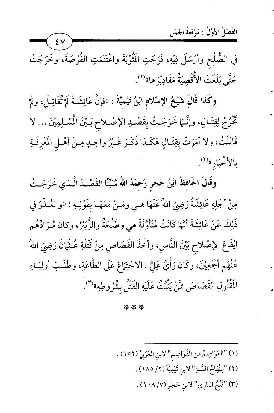 وكَذا قَالَ شَيْخُ الإسْلامِ ابْنُ تَيْمِيَّةَ: «فإنَّ عَائِشَةَ لَمْ تُقَاتِلْ، ولَمْ تَخْرُجْ لِقِتَالٍ، وإنَّمَا خَرَجَتْ بِقَصْدِ الإصْلاحِ بَيْنَ المُسْلِمِيْنَ ... لا قَاتَلَتْ، ولا أمَرَتْ بِقِتَالٍ هَكَذا ذَكَرَ غَيْرُ واحِدٍ مِنْ أهْلِ المَعْرِفَةِ بالأخْبَارِ» (¬2).