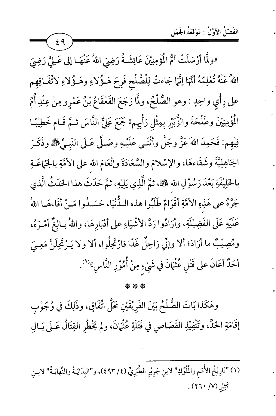 «ولمَّا أرْسَلَتْ أمُّ المُؤْمِنِيْنَ عَائِشَةُ رَضِيَ اللهُ عَنْهَا إلى عَلِيٍّ رَضِيَ اللهُ عَنْهُ تُعْلِمُهُ أنَّهَا إنَّمَا جَاءتْ لِلْصُّلْحِ فَرِحَ هَؤُلاءِ وهَؤُلاءِ لاتِّفَاقِهِم على رِأْيٍ واحِدٍ: