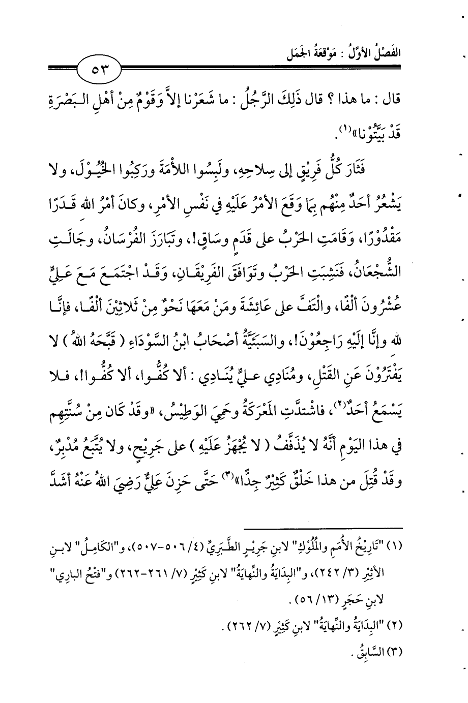 فَثَارَ كُلُّ فَرِيْقٍ إلى سِلاحِهِ، ولَبِسُوا اللأْمَةَ ورَكِبُوا الخُيُوْلَ، ولا يَشْعُرُ أحَدٌ مِنْهُم بِمَا وَقَعَ الأمْرُ عَلَيْهِ في نَفْسِ الأمْرِ، وكانَ أمْرُ اللهِ قَدَرًا مَقْدُوْرًا، وَقَامَتِ الحَرْبُ على قَدَمٍ وسَاقٍ، وتَبَارَزَ الفُرْسَانُ، وجَالَتِ الشُّجْعَانُ، فَنَشِبَتِ الحَرْبُ وتَوَافَقَ الفَرِيْقَانِ، وَقَدْ اجْتَمَعَ مَعَ عَلِيٍّ عُشْرُونَ ألْفًا، والْتَفَّ على عَائِشَةَ ومَنْ مَعَهَا نَحْوٌ مِنْ ثَلاثِيْنَ ألْفًا، فإنَّا للهِ وإنَّا إلَيْهِ رَاجِعُوْنَ، والسَبَئَيَّةُ أصْحَابُ ابْنِ السَّوْدَاءِ (قَبَّحَهُ اللهُ) لا يَفْتَرُوْنَ عَنِ القَتْلِ، ومُنَادِي عليٍّ يُنَادِي: ألا كُفُّوا، ألا كُفُّوا، فلا يَسْمَعُ أحَدٌ (¬2)، فاشْتدَّتِ المَعْرَكَةُ وحَمِيَ الوَطِيْسُ، «وقَدْ كَان مِنْ سُنَّتِهِم في هذا اليَوْمِ أنَّهُ لا يُذَفَّفُ (لا يُجْهَزُ عَلَيْهِ) على جَرِيْحٍ، ولا يُتَّبَعُ مُدْبِرٌ، وقَدْ قُتِلَ من هذا خَلْقٌ كَثِيْرٌ جِدًّا» (¬3) حَتَّى حَزِنَ عَلِيٌّ رَضِيَ اللهُ عَنْهُ أشَدَّ