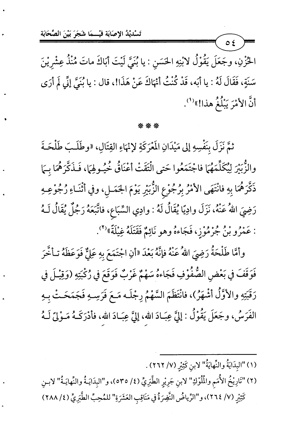 (¬2) «تَارِيْخُ الأُمَمِ والمُلُوْكِ» لابنِ جَرِيْرٍ الطَّبَرِيِّ (4/ 535)، و «البِدَايَةُ والنِّهايَةُ» لابنِ كَثِيْرٍ (7/ 264)، و «الرِّياضُ النَّضِرَةُ في مَنَاقِبِ العَشَرَةِ» للمُحِبِّ الطَّبَرِيِّ (4/ 288).