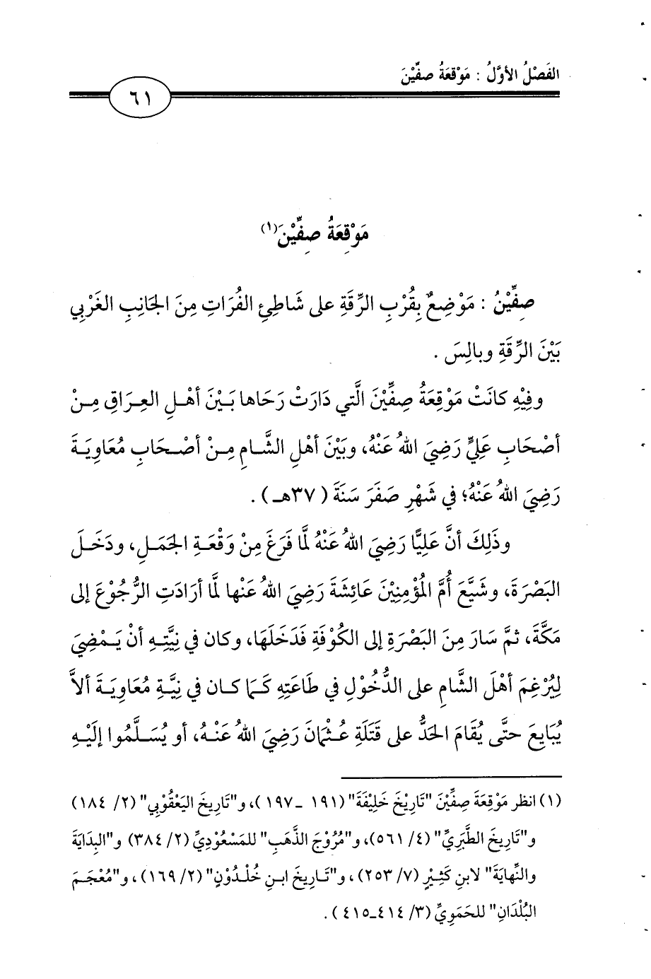 (¬1) انظر مَوْقِعَةَ صِفِّيْنَ «تَارِيْخَ خَلِيْفَةَ» (191 ـ 197)، و «تَارِيخَ اليَعْقُوْبِي» (2/ 184) و «تَارِيخَ الطَّبَرِيِّ» (4/ 561)، و «البِدَايَةَ والنِّهايَةَ» لابنِ كَثِيْرٍ (7/ 253)، و «تَارِيخَ ابنِ خُلْدُوْنٍ» (2/ 169) و «مُعْجَمَ البُلْدَانِ» للحَمَوِيِّ (3/ 414 ـ 415)
