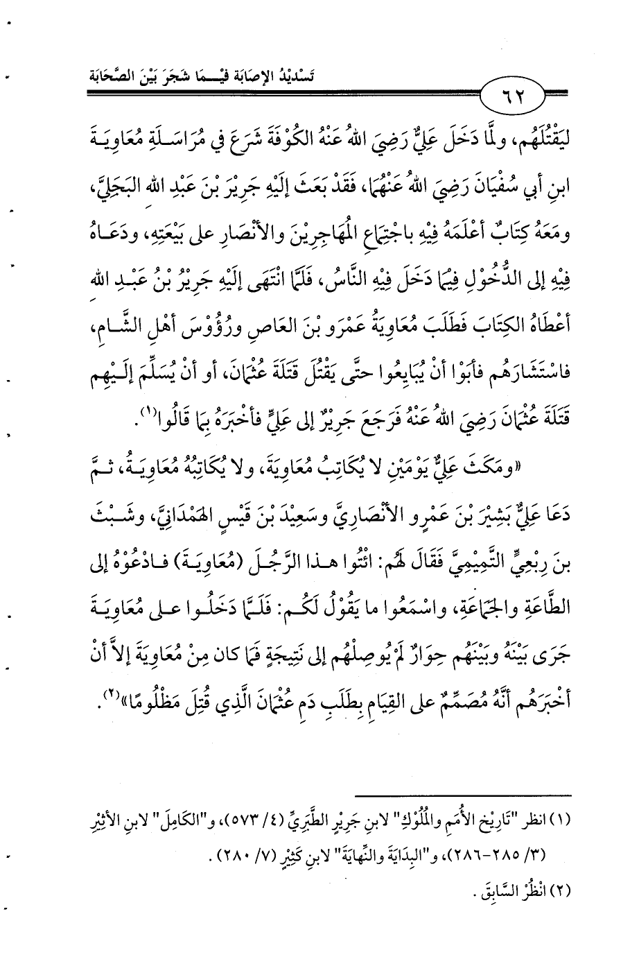 ليَقْتُلَهُم، ولمَّا دَخَلَ عَلِيٌّ رَضِيَ اللهُ عَنْهُ الكُوْفَةَ شَرَعَ في مُرَاسَلَةِ مُعَاوِيَةَ ابنِ أبي سُفْيَانَ رَضِيَ اللهُ عَنْهُمَا، فَقَدْ بَعَثَ إلَيْهِ جَرِيْرَ بْنَ عَبْدِ اللهِ البَجَلِيَّ، ومَعَهُ كِتَابٌ أعْلَمَهُ فِيْهِ باجْتِمَاعِ المُهَاجِرِيْنَ والأنْصَارِ على بَيْعَتِهِ، ودَعَاهُ فِيْهِ إلى الدُّخُوْلِ فِيْمَا دَخَلَ فِيْهِ النَّاسُ، فَلَمَّا انْتَهَى إلَيْهِ جَرِيْرُ بْنُ عَبْدِ اللهِ أعْطَاهُ الكِتَابَ فَطَلَبَ مُعَاوِيَةُ عَمْرَو بْنَ العَاصِ ورُؤُوْسَ أهْلِ الشَّامِ، فاسْتَشَارَهُم فأبَوْا أنْ يُبَايِعُوا حتَّى يَقْتُلَ قَتَلَةَ عُثْمَانَ، أو أنْ يُسَلِّمَ إلَيْهِم قَتَلَةَ عُثْمَانَ رَضِيَ اللهُ عَنْهُ فَرَجَعَ جَرِيْرٌ إلى عَلِيٍّ فأخْبَرَهُ بِمَا قَالُوا.
