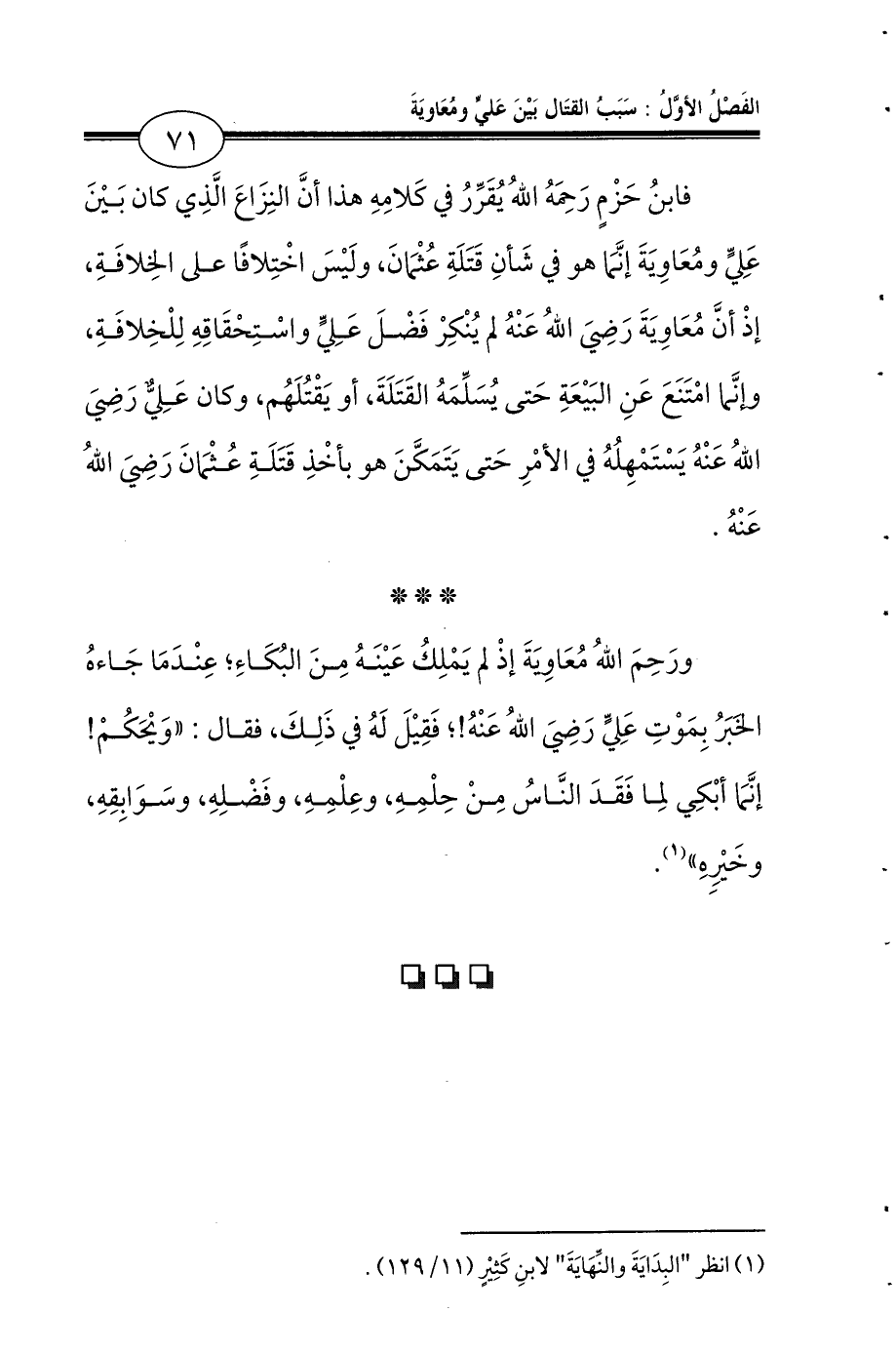 فابنُ حَزْمٍ رَحِمَهُ اللهُ يُقَرِّرُ في كَلامِهِ هذا أنَّ النِزَاعَ الَّذِي كان بَيْنَ عَلِيٍّ ومُعَاوِيَةَ إنَّمَا هو في شَأنِ قَتَلَةِ عُثْمَانَ، ولَيْسَ اخْتِلافًا على الخِلافَةِ، إذْ إنَّ مُعَاوِيَةَ رَضِيَ اللهُ عَنْهُ لم يُنْكِرْ فَضْلَ عَلِيٍّ واسْتِحْقَاقَهِ لِلْخِلافَةِ، وإنَّما امْتَنَعَ عَنِ البَيْعَةِ حَتى يُسَلِّمَهُ القَتَلَةَ، أو يَقْتُلَهُم، وكان عَلِيٌّ رَضِيَ اللهُ عَنْهُ يَسْتَمْهِلُهُ في الأمْرِ حَتى يَتَمَكَّنَ هو بأخْذِ قَتَلَةِ عُثْمَانَ رَضِيَ اللهُ عَنْهُ.
