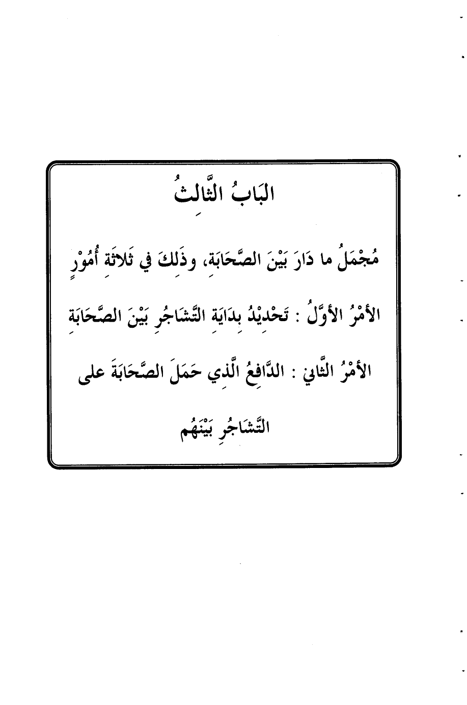 مُجْمَلُ ما دَارَ بَيْنَ الصَّحَابَةِ رَضِيَ اللهُ عَنْهُم وذَلِكَ في ثَلاثَةِ أُمُوْرٍ