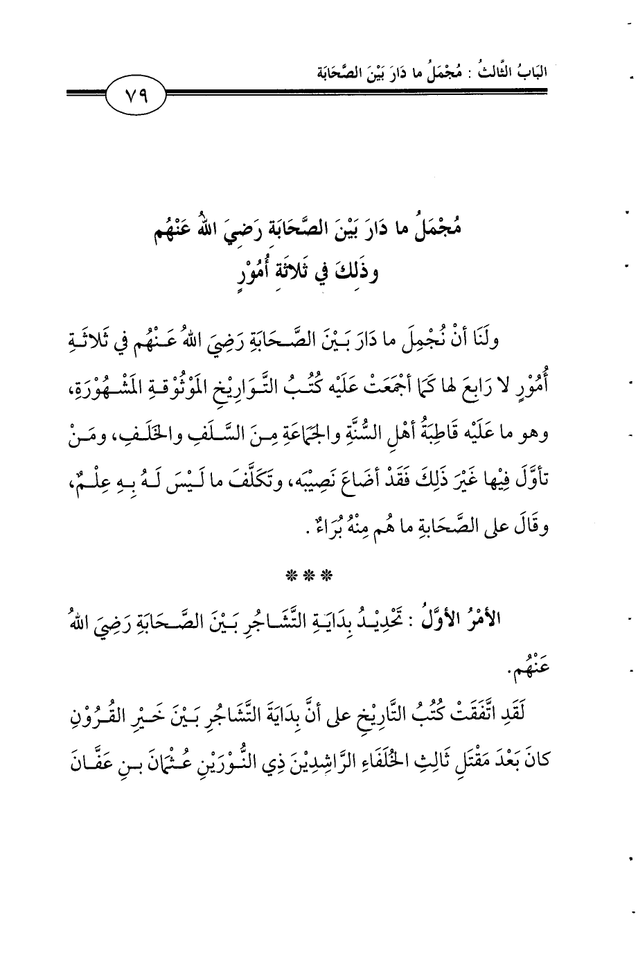 ولَنَا أنْ نُجْمِلَ ما دَارَ بَيْنَ الصَّحَابَةِ رَضِيَ اللهُ عَنْهُم في ثَلاثَةِ أُمُوْرٍ لا رَابِعَ لها كَمَا أجْمَعَتْ عَلَيْه كُتُبُ التَّوَارِيْخِ المَوْثُوْقةِ المَشْهُوْرَةِ، وهو ما عَلَيْه قَاطِبَةُ أهْلِ السُّنَّةِ والجَمَاعَةِ مِنَ السَّلَفِ والخَلَفِ، ومَنْ تأوَّلَ فِيْها غَيْرَ ذَلِكَ فَقَدْ أضَاعَ نَصِيْبَه، وتَكَلَّفَ ما لَيْسَ لَهُ بِهِ عِلْمٌ، وقَالَ على الصَّحَابةِ ما هُم مِنْهُ بُرَاءٌ.
