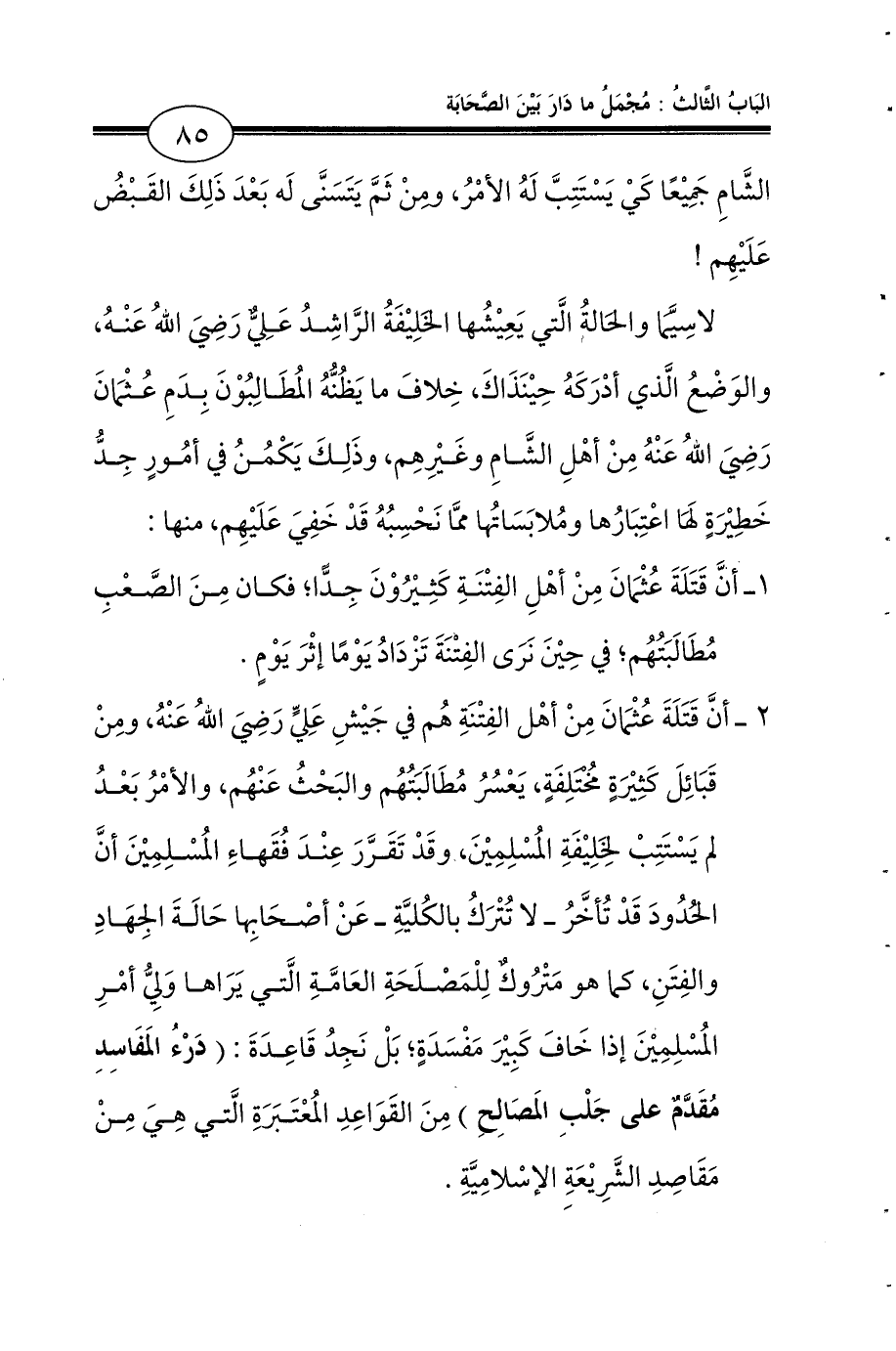 ثَانيًا: أنَّ قَتَلَةَ عُثْمَانَ مِنْ أهْل الفِتْنَةِ هُم في جَيْشِ عَلِيٍّ رَضِيَ اللهُ عَنْهُ، ومِنْ قَبَائِلَ كَثِيْرَةٍ مُخْتَلِفَةٍ، يَعْسُرُ مُطَالَبَتُهُم والبَحْثُ عَنْهُم، والأمْرُ بَعْدُ لم يَسْتَتِبْ لِخَلِيْفَةِ المُسْلِمِيْنَ، وقَدْ تَقَرَّرَ عِنْدَ فُقَهاءِ المُسْلِمِيْنَ أنَّ الحُدُودَ قَدْ تُأخَّرُ ـ لا تُتْرَكُ بالكُليَّةِ ـ عَنْ أصْحَابِها حَالَةَ الجِهَادِ والفِتَنِ، كما هو مَتْرُوكٌ لِلْمَصْلَحَةِ العَامَّةِ الَّتي يَرَاها وَلِيُّ أمْرِ المُسْلِمِيْنَ إذا خَافَ كَبِيْرَ مَفْسَدَةٍ؛ بَلْ نَجِدُ قَاعِدَةَ: (دَرْءُ المَفَاسِدِ مُقَدَّمٌ على جَلْبِ المَصَالِحِ) مِنَ القَوَاعِدِ المُعْتَبَرَةِ الَّتي هِيَ مِنْ مَقَاصِدِ الشَّرِيْعَةِ الإسْلامِيَّةِ.