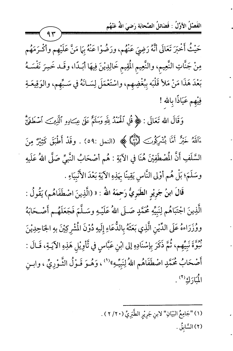وَقَالَ الله تَعَالَى: {قُلِ الْحَمْدُ لِلَّهِ وَسَلَامٌ عَلَى عِبَادِهِ الَّذِينَ اصْطَفَى آللَّهُ خَيْرٌ أَمَّا يُشْرِكُونَ (59)} [النمل: 59]. وقَدْ أَطْبَقَ كَثِيْرٌ مِنَ السَّلَفِ أَنَّ المُصْطَفِيْنَ هُنَا في الآيَةِ: هُم أصْحَابُ النَّبيِّ - صلى الله عليه وسلم -؛ بَلْ هُم أوْلى النَّاسِ يَقِينًا بِهَذِهِ الآيَةِ بَعْدَ الأَنْبِيَاءِ.