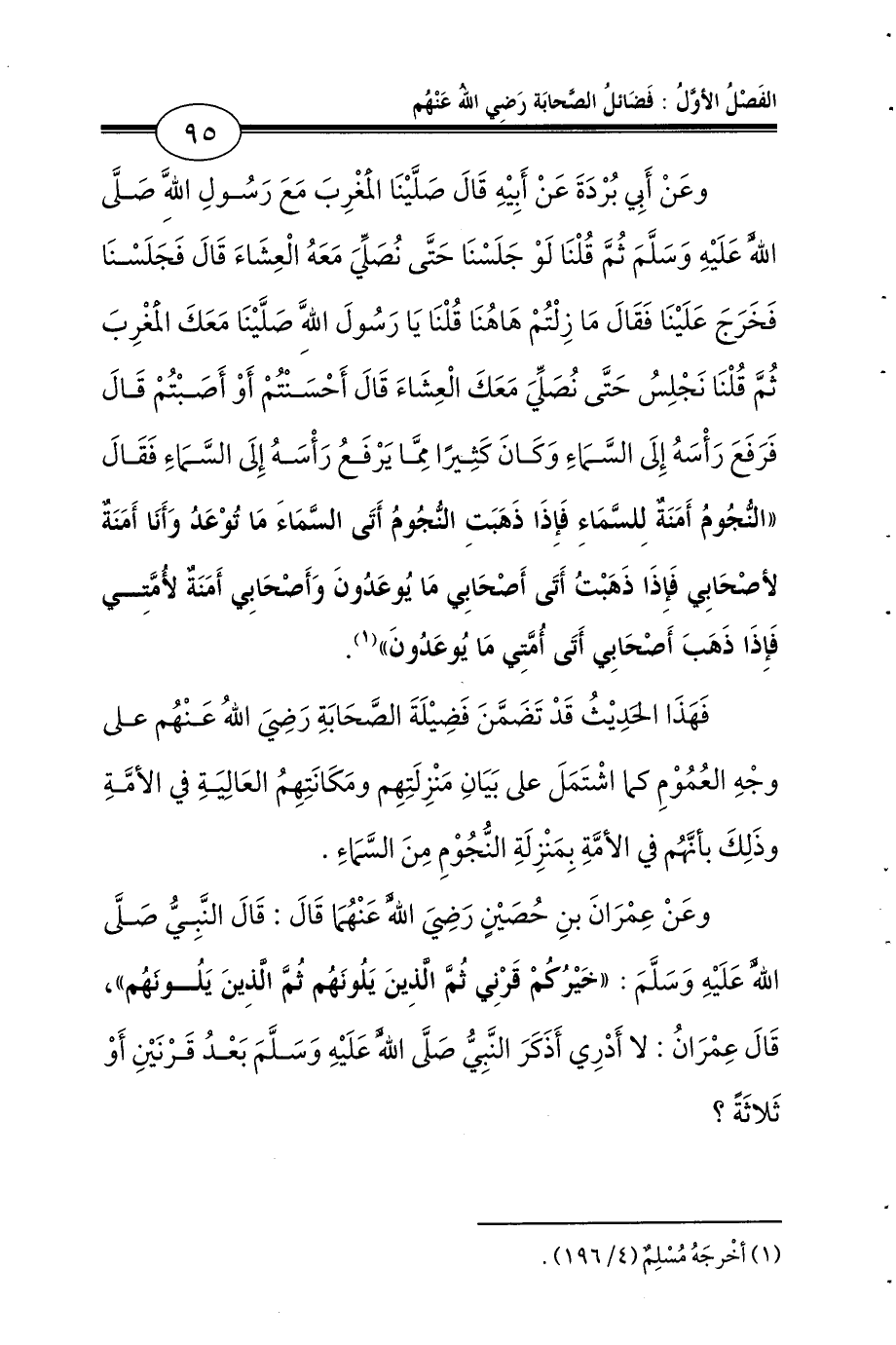 وعَنْ أَبِي بُرْدَةَ عَنْ أَبِيْهِ قَالَ صَلَّيْنَا الْمَغْرِبَ مَعَ رَسُولِ اللَّهِ - صلى الله عليه وسلم - ثُمَّ قُلْنَا لَوْ جَلَسْنَا حَتَّى نُصَلِّيَ مَعَهُ الْعِشَاءَ قَالَ فَجَلَسْنَا فَخَرَجَ عَلَيْنَا فَقَالَ مَا زِلْتُمْ هَاهُنَا قُلْنَا يَا رَسُولَ اللَّهِ صَلَّيْنَا مَعَكَ الْمَغْرِبَ ثُمَّ قُلْنَا نَجْلِسُ حَتَّى نُصَلِّيَ مَعَكَ الْعِشَاءَ قَالَ أَحْسَنْتُمْ أَوْ أَصَبْتُمْ قَالَ فَرَفَعَ رَأْسَهُ إِلَى السَّمَاءِ وَكَانَ كَثِيرًا مِمَّا يَرْفَعُ رَأْسَهُ إِلَى السَّمَاءِ فَقَالَ «النُّجُومُ أَمَنَةٌ لِلسَّمَاءِ فَإِذَا ذَهَبَتِ النُّجُومُ أَتَى السَّمَاءَ مَا تُوْعَدُ وَأَنَا أَمَنَةٌ لأصْحَابِي فَإِذَا ذَهَبْتُ أَتَى أَصْحَابِي مَا يُوعَدُونَ وَأَصْحَابِي أَمَنَةٌ لأُمَّتِي فَإِذَا ذَهَبَ أَصْحَابِي أَتَى أُمَّتِي مَا يُوعَدُونَ» (¬1) رَوَاهُ مُسْلِمٌ.