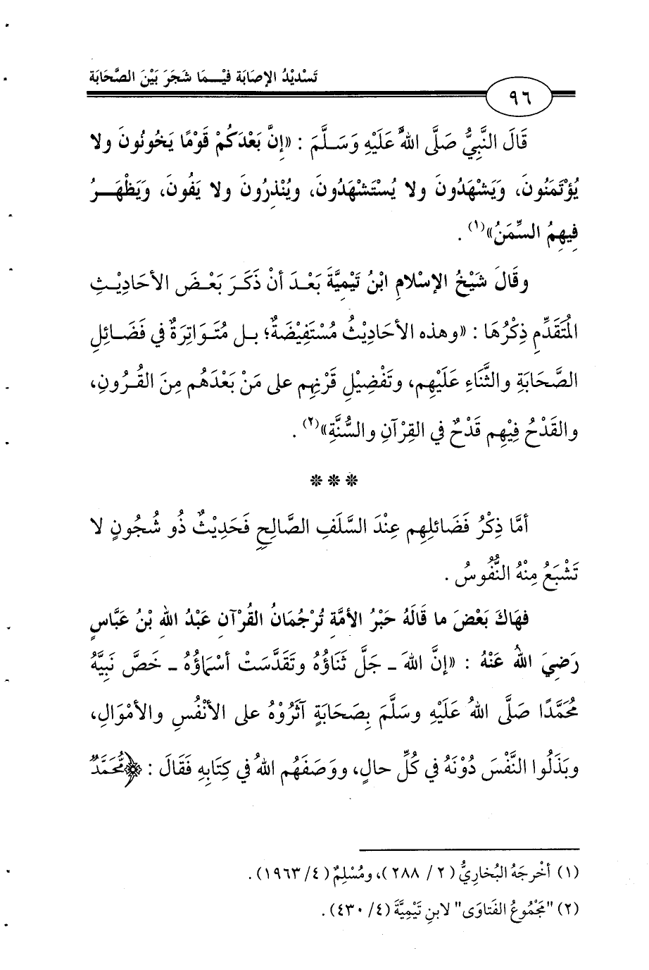 وقَالَ شَيْخُ الإسْلامِ ابْنُ تَيْمِيَّةَ بَعْدَ أنْ ذَكَرَ بَعْضَ الأحَادِيْثِ المُتَقَدِّمِ ذِكْرُهَا: «وهذه الأحَادِيْثُ مُسْتَفِيْضَةٌ؛ بل مُتَوَاتِرَةٌ في فَضَائِلِ الصَّحَابَةِ والثَّنَاءِ عَلَيْهِم، وتَفْضِيْلِ قَرْنِهِم على مَنْ بَعْدَهُم مِنَ القُرُونِ، والقَدْحُ فِيْهِم قَدْحٌ في القِرْآنِ والسُّنَّةِ» (¬2).