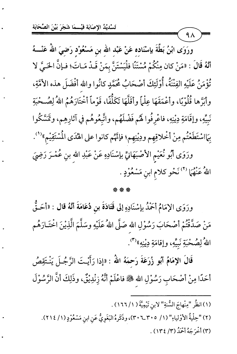 ورَوَى ابْنُ بَطَّةَ بإسْنَادِهِ عَنْ عَبْدِ اللهِ بنِ مَسْعُوْدٍ رَضِيَ اللهُ عَنْهُ أنَّهُ قَالَ: «مَنْ كان مِنْكُمْ مُسْتَنًا فلْيَسْتَنَّ بِمَنْ قَدْ مَاتَ؛ فإنَّ الحَيَّ لا تُؤْمَنُ عَلَيْهِ الفِتْنَةُ، أُوْلَئِكَ أصْحَابُ مُحَمَّدٍ كانُوا واللهِ أفْضَلَ هذه الأمَّةِ، وأبَرَّها قُلُوْبًا، وأعْمَقَهَا عِلْماً وأقَلَّهَا تَكَلُّفًا، قَوْماً أخْتَارَهُمُ اللهُ لِصُحْبَةِ نَبِيِّهِ، وإقَامَةِ دِيْنِهِ، فاعْرِفُوا لَهُم فَضْلَهُم، واتَّبِعُوهُم في آثارِهِم، وتَمَسَّكُوا بِمَااسْتَطَعْتُم مِنْ أخْلاقِهِم ودِيْنِهِم؛ فإنَّهُم كانوا على الهُدَى المُسْتَقِيْمِ» (¬1).