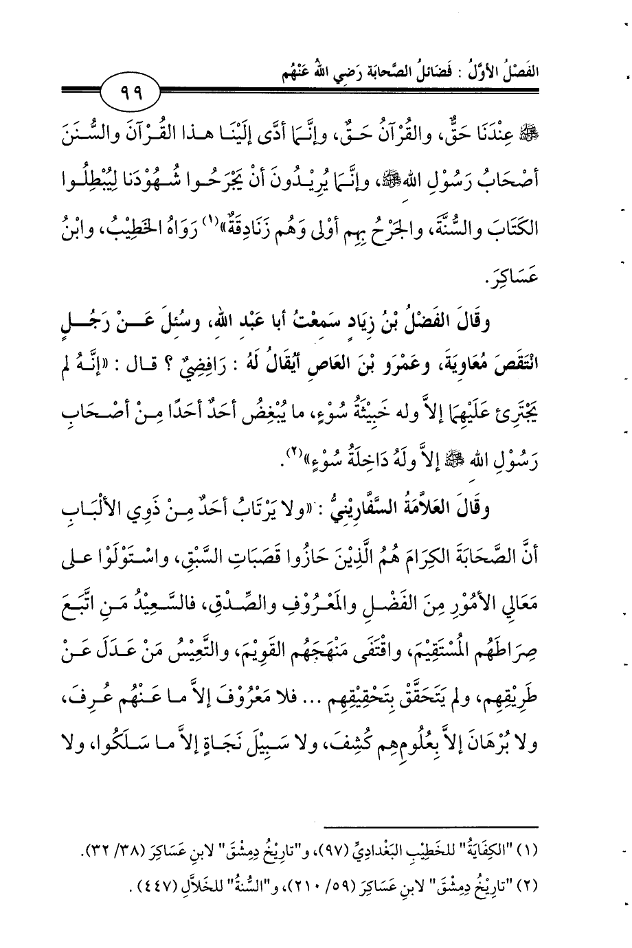 وقَالَ العَلاَّمَةُ السَّفَّارِيْنِيُّ: «ولا يَرْتَابُ أحَدٌ مِنْ ذَوِي الألْبَابِ أنَّ الصَّحَابَةَ الكِرَامَ هُمُ الَّذِيْنَ حَازُوا قَصَبَاتِ السَّبْقِ، واسْتَوْلَوْا على مَعَالِي الأمُوْرِ مِنَ الفَضْلِ والمَعْرُوْفِ والصِّدْقِ، فالسَّعِيْدُ مَنِ اتَّبَعَ صِرَاطَهُم المُسْتَقِيْمَ، واقْتَفَى مَنْهَجَهُم القَوِيْمَ، والتَّعِيْسُ مَنْ عَدَلَ عَنْ طَرِيْقِهِم، ولم يَتَحَقَّقْ بِتَحْقِيْقِهِم ... فلا مَعْرُوْفَ إلاَّ ما عَنْهُم عُرِفَ، ولا بُرْهَانَ إلاَّ بِعُلُومِهِم كُشِفَ، ولا سَبِيْلَ نَجَاةٍ إلاَّ ما سَلَكُوا، ولا
