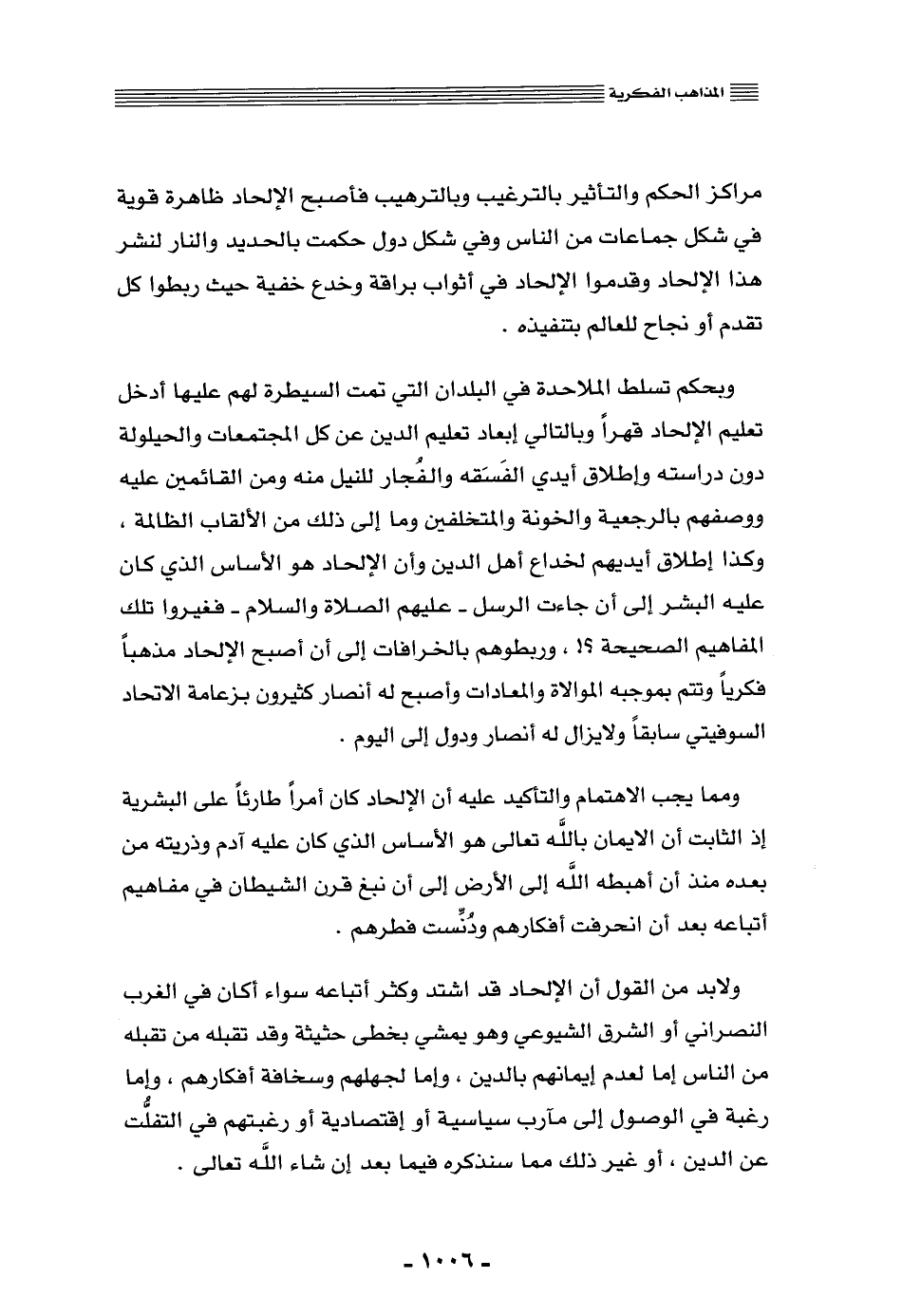 مراكز الحكم, والتأثير بالترغيب وبالترهيب, فأصبح الإلحاد ظاهرة قوية في شكل جمعات من الناس, وفي شكل دول حكمت بالحديد والنار لنشر هذا الإلحاد, وقدموا الإلحاد في أثواب براقة وخدع خفية؛ حيث ربطوا كل تقدُّم أو نجاح للعالم بتنفيذه.