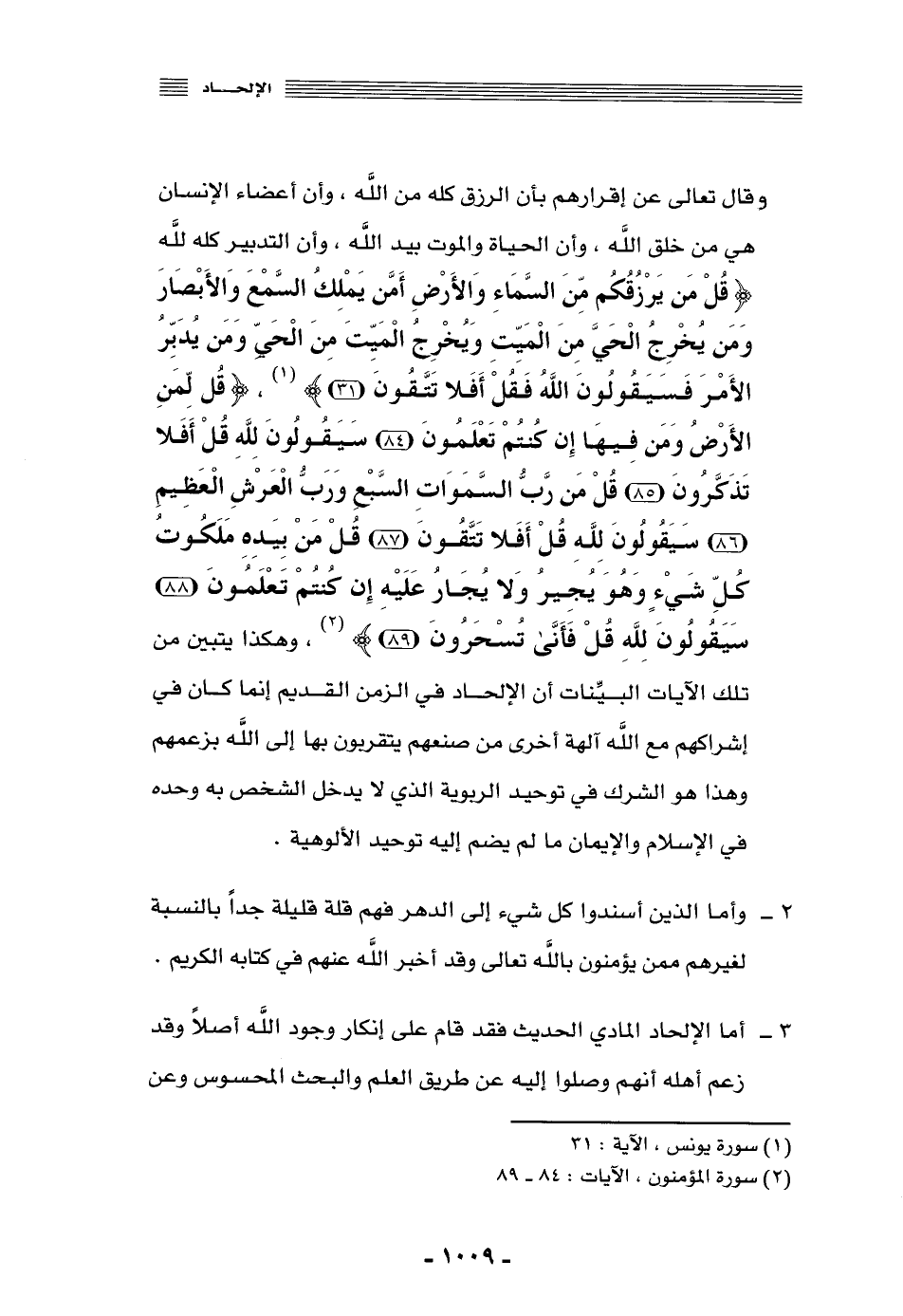 وقال تعالى عن إقرارهم بأن الرزق كله من الله، وأن أعضاء الإنسان هي من خلق الله، وأن الحياة والموت بيد الله، وأن التدبير كله لله: {قُلْ مَنْ يَرْزُقُكُمْ مِنَ السَّمَاءِ وَالْأَرْضِ أَمَّنْ يَمْلِكُ السَّمْعَ وَالْأَبْصَارَ وَمَنْ يُخْرِجُ الْحَيَّ مِنَ الْمَيِّتِ وَيُخْرِجُ الْمَيِّتَ مِنَ الْحَيِّ وَمَنْ يُدَبِّرُ الْأَمْرَ فَسَيَقُولُونَ اللَّهُ فَقُلْ أَفَلَا تَتَّقُونَ} 1، {قُلْ لِمَنِ الْأَرْضُ وَمَنْ فِيهَا إِنْ كُنْتُمْ تَعْلَمُونَ، سَيَقُولُونَ لِلَّهِ قُلْ أَفَلَا تَذَكَّرُونَ، قُلْ مَنْ رَبُّ السَّمَاوَاتِ السَّبْعِ وَرَبُّ الْعَرْشِ الْعَظِيمِ، سَيَقُولُونَ لِلَّهِ قُلْ أَفَلَا تَتَّقُونَ، قُلْ مَنْ بِيَدِهِ مَلَكُوتُ كُلِّ شَيْءٍ وَهُوَ يُجِيرُ وَلَا يُجَارُ عَلَيْهِ إِنْ كُنْتُمْ تَعْلَمُونَ، سَيَقُولُونَ لِلَّهِ قُلْ فَأَنَّى تُسْحَرُونَ} 2، وهكذا يتبين من تلك الآيات البينات أن الإلحاد في الزمن القديم إنما كان في إشراكهم مع الله آلهة أخرى من صنعهم, يتقربون إلى الله بزعمهم, وهذا هو الشرك في توحيد الربوية الذي لا يدخل الشخص به وحده في الإسلام والإيمان ما لم يضمّ إليه توحيد الألوهية.