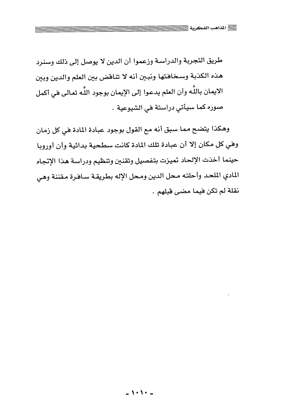 طريق التجربة والدراسة, وزعموا أن الدين لا يوصل إلى ذلك, وسنرد هذه الكذبة وسخافتها, ونبين أنه لا تناقض بين العلم والدين وبين الإيمان بالله, وأن العلم يدعو إلى الإيمان بوجود الله تعالى في أكمل صورة كما سيأتي دراسته في الشيوعية.