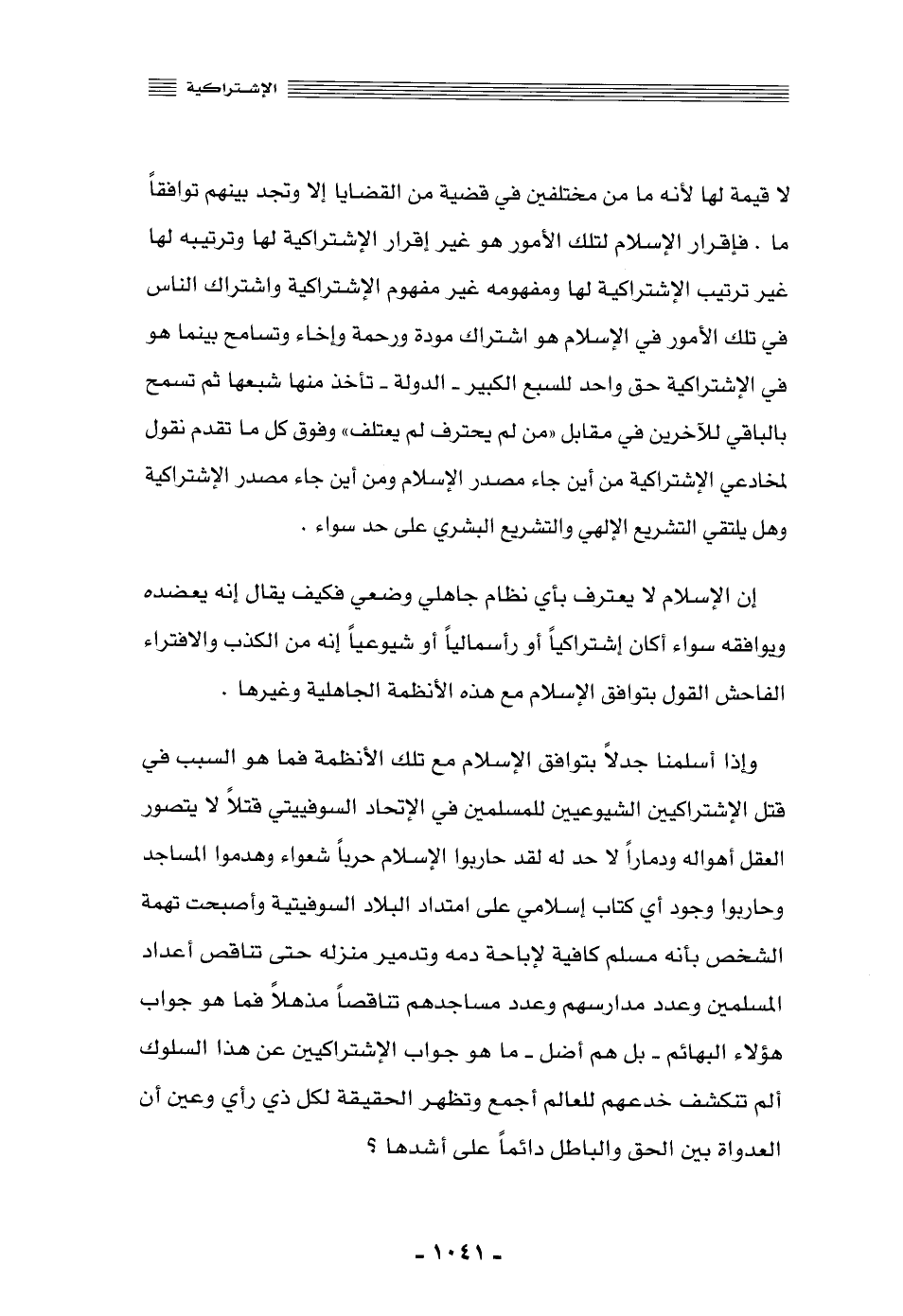 وإذا سلَّمنا جدلًا بتوافق الإسلام مع تلك الأنظمة, فما هو السبب في قتل الاشتراكيين الشيوعيين للمسلمين في الاتحاد السوفييتي قتلًا لا يتصوّر العقل أهواله, ودمارًا لا حدَّ له, لقد حاربوا الإسلام حربًا شعواء, وهدموا المساجد وحاربوا وجود أي كتاب إسلامي على امتداد البلاد السوفيتية, وأصبحت تهمة الشخص بأنه مسلم كافية لإباحة دمه وتدمير منزله, حتى تناقص أعداد المسلمين وعدد مدراسهم وعدد مساجدهم تناقصًا مذهلًا, فما هو جواب هؤلاء البهائم -بل هم أضل- ما هو جواب الاشتراكيين عن هذا السلوك, ألم تنكشف خدعهم للعالم أجمع؟ وتظهر الحقيقة لكل ذي رأي وعين أن العداواة بين الحق والباطل دائمًا على أشدها؟