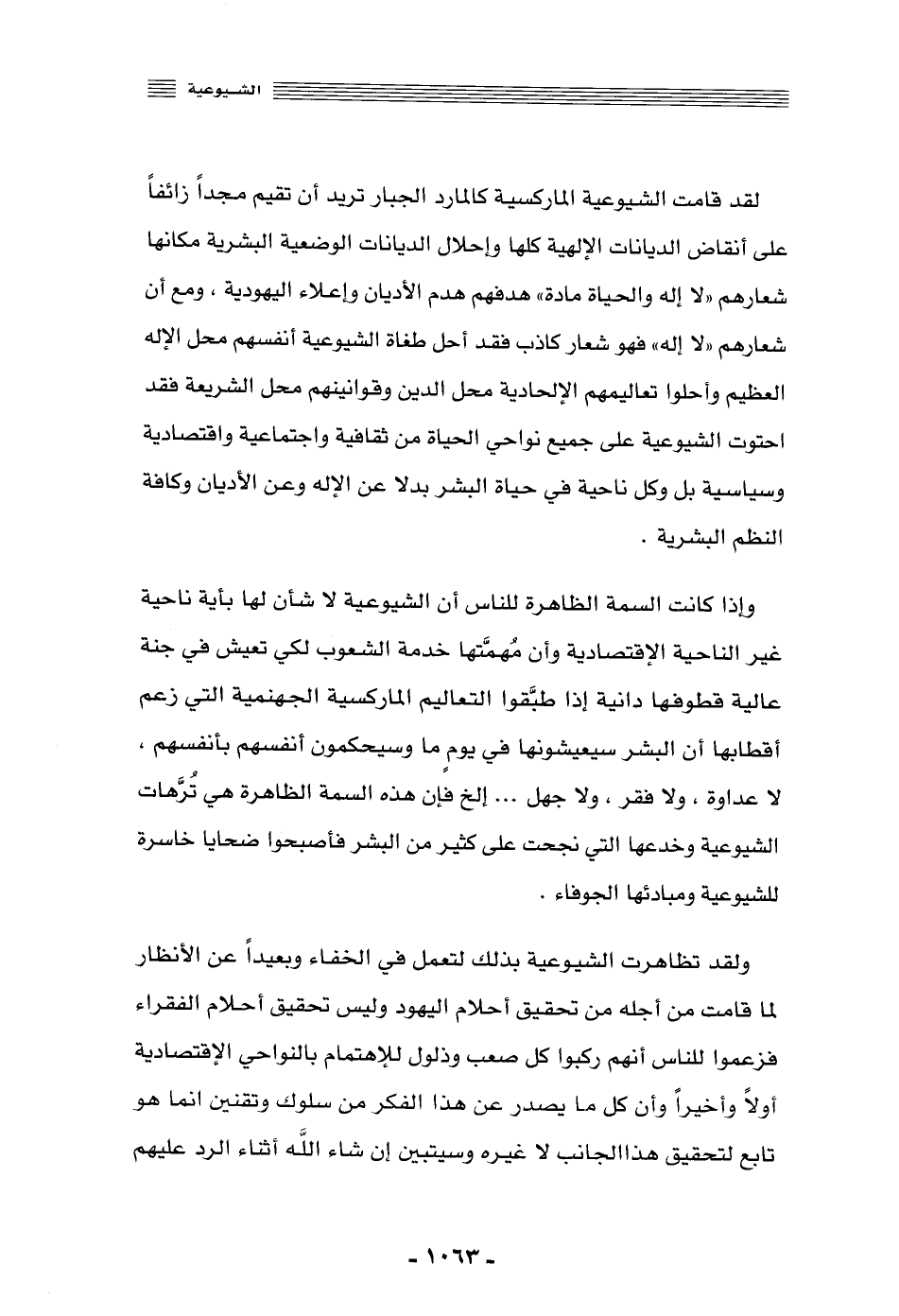 لقد قامت الشيوعية الماركسية كالمارد الجبار تريد أن تقيم مجدًا زائفًا على أنقاض الديانات الإلهية كلها, وإحلال الديانات الوضعية البشرية مكانها, شعارهم "لا إله والحياة مادة", هدفهم هدم الأديان وإعلاء اليهودية، ومع أن شعارهم "لا إله" فهو شعار كذّاب, فقد أحلَّ طغاة الشيوعية أنفسهم محل الإله العظيم, وأحلوا تعاليمهم الإلحادية محل الدين, وقوانيهم محل الشريعة, فقد احتوت الشيوعية على جميع نواحي الحياة من ثقافية واجتماعية واقتصادية وسياسية, بل وكل ناحية في حياة البشر بدلًا عن الإله وعن الأديان وكافَّة النظم البشرية.
