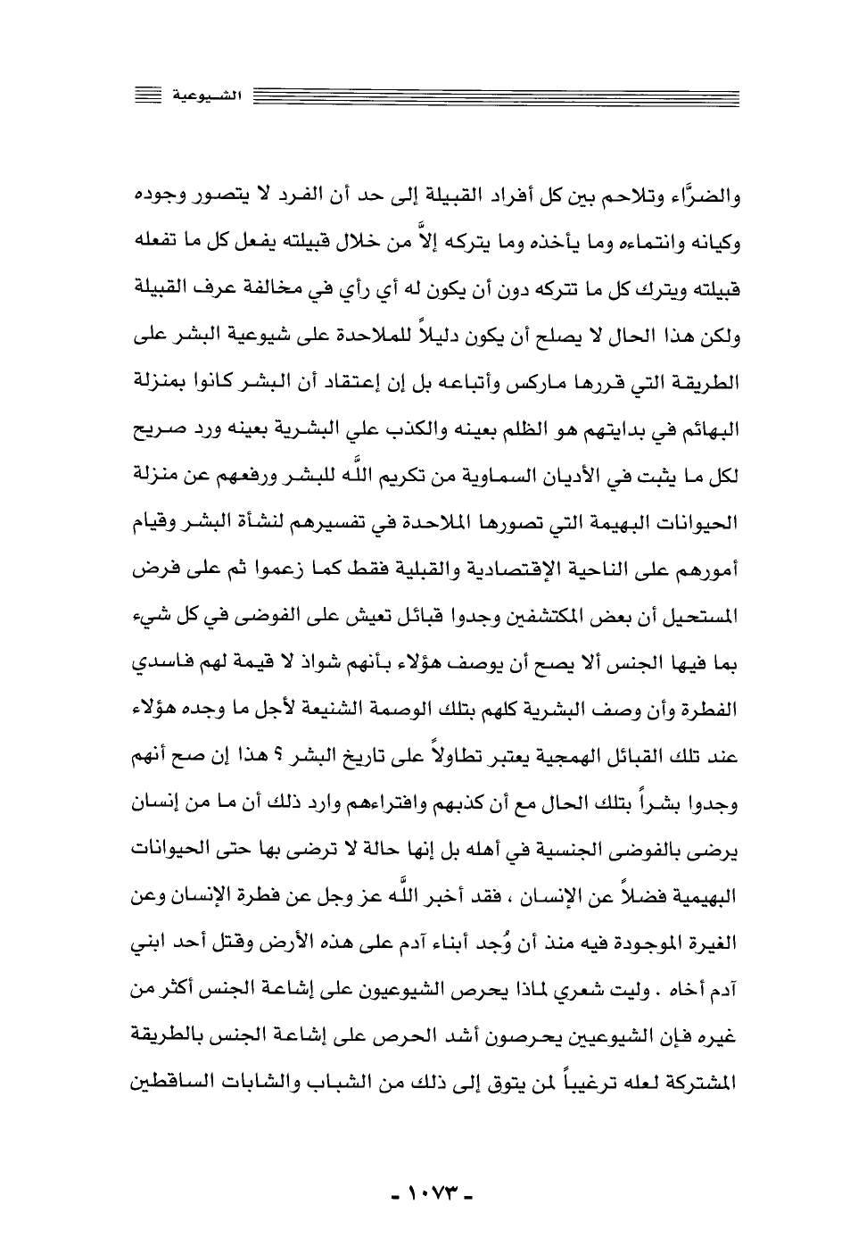 والضراء, وتلاحم بين كل أفراد القبيلة إلى حدِّ أن الفرد لا يتصور وجوده وكيانه وانتماءه, وما يأخذه وما يتركه, إلّا من خلال قبيلته, يفعل كل ما تفعله قبيلته, ويترك كل ما تتركه دون أن يكون له أي رأي في مخالفة عرف القبيلة, ولكن هذا الحال لا يصلح أن يكون دليلًا للملاحدة على شيوعية البشر على الطريقة التي قرَّرها ماركس وأتباعه, بل إن اعتقاد أن البشر كانوا بمنزلة البهائم في بدايتهم هو الظلم بعينه, والكذب على البشرية بعينه, وردٌّ صريح لكل ما يثبت في الأديان السماوية من تكريم الله للبشر ورفعهم عن منزلة الحيوانات البهيمة التي تصورها الملاحدة في تفسيرهم لنشأة البشر, وقيام أمورهم على الناحية الاقتصادية والقبلية فقط كما زعموا, ثم على فرض المستحيل أن بعض المكتشفين وجدوا قبائل تعيش على الفوضى في كل شيء بما فيها الجنس, ألا يصح أن يوصف هؤلاء بأنهم شواذّ لا قيمة لهم, فاسدي الفطرة, وأن وصف البشرية كلهم بتلك الوصمة الشنيعة لأجل ما وجده هؤلاء عند تلك القبائل الهمجية يعتبر تطاولًا على تاريخ البشر؟ هذا إن صح أنهم وجدوا بشرًا بتلك الحال, مع أن كذبهم وافتراءهم وارد, ذلك أن ما من إنسان يرضى بالفوضى الجنسية في أهله, بل إنها حالة لا ترضى بها حتى الحيونات البهيمية فضلًا عن الإنسان، فقد أخبر الله -عز وجل- عن فطرة الإنسان وعن الغيرة الموجودة فيه منذ أن وجد أبناء آدم على هذه الأرض وقتل أحد بني آدم آخاه, وليت شعري لماذا يحرص الشيوعيون على إشاعة الجنس أكثر من غيره, فإن الشيوعيين يحرصون أشد الحرص على إشاعة الجنس بالطريقة المشتركة لعلَّه ترغيبًا لمن يتوق إلى ذلك من الشباب والشابات الساقطين