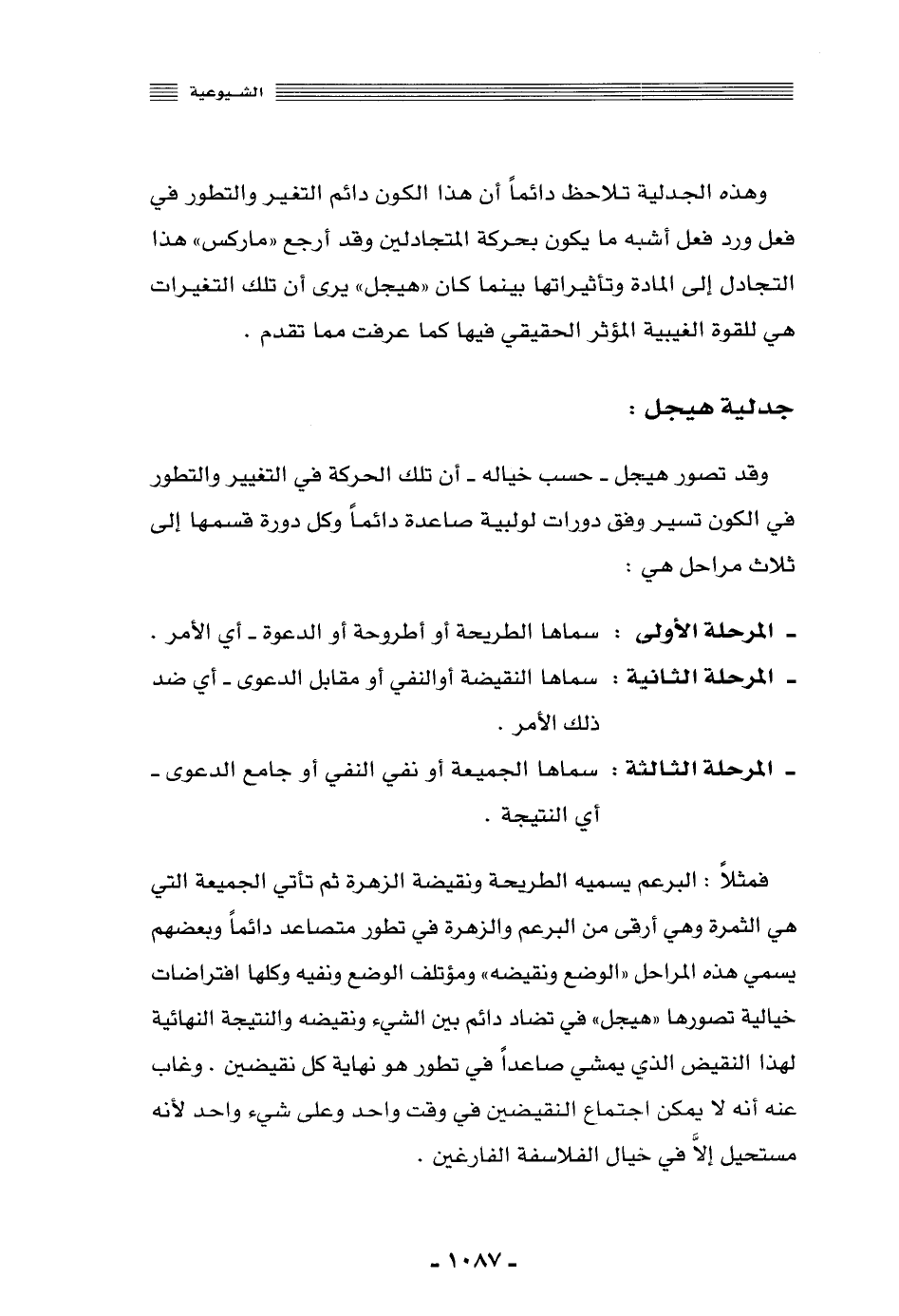 فمثلًا: البرعم يسميه الطريحة, ونقيضة الزهرة, ثم تأتي الجميعة التي هي الثمرة, وهي أرقى من البرعم والزهرة في تطور متصاعد دائمًا, وبعضهم يسمي هذه المراحل "الوضع ونقيضه", ومؤتلف الوضع ونفيه, وكلها افتراضات خيالية تصورها "هيجل" في تضادٍّ دائم بين الشيء ونقيضه, والنتيجة النهائية لهذا النقيض الذي يمشي صاعدًا في تطورٍ هو نهاية كل نقيضين. وغاب عنه أنه لا يمكن اجتماع النقيضين في وقت واحد على شيء واحد؛ لأنه مستحيل إلّا في خيال الفلاسفة الفارغين.