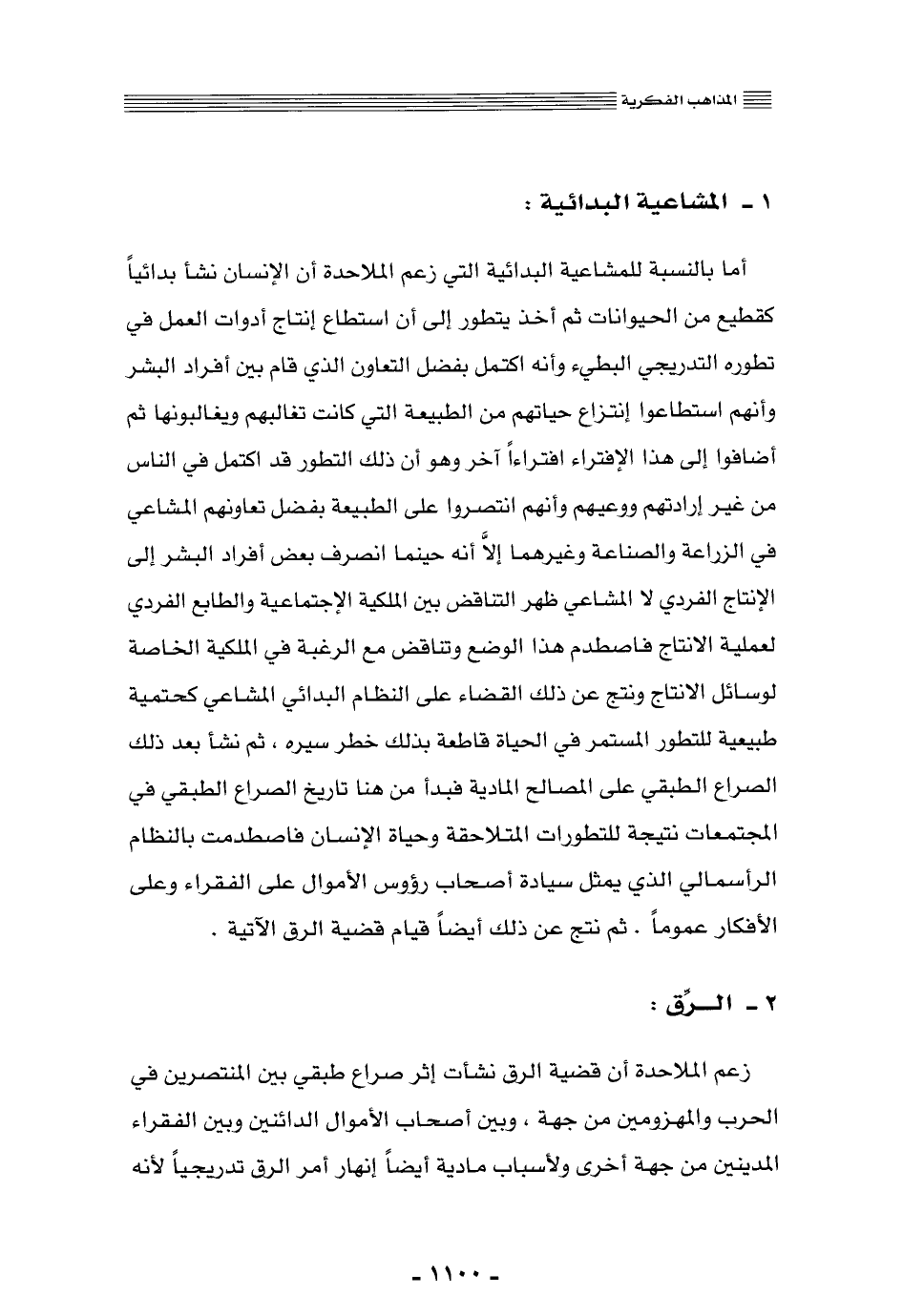 أما بالنسبة للمشاعية البدائية التي زعم الملاحدة أن الإنسان نشأ بدائيًّا كقطيع من الحيوانات, ثم أخذ يتطور إلى أن استطاع إنتاج أدوات العمل في تطوره التدريجي البطيء, وأنه اكتمل بفضل التعاون الذي قام بين أفراد البشر, وأنهم استطاعوا انتزاع حياتهم من الطبيعة التي كانت تغالبهم ويغالبونها, ثم أضافوا إلى هذا الافتراء أفتراءً آخر وهو أن ذلك التطور قد اكتمل في الناس من غير إرادتهم ووعيهم, وأنهم انتصروا على الطبيعة بفضل تعاونهم المشاعيّ في الزراعة والصناعة وغيرهما, إلّا أنه حينما انصرف بعض أفراد البشر إلى الإنتاج الفردي لا المشاعي ظهر التناقض بين الملكية الاجتماعية والطابع الفردي لعملية الإنتاج, فاصطدم هذا الوضع وتناقض مع الرغبة في الملكية الخاصة لوسائل الإنتاج, ونتج عن ذلك القضاء على النظام البدائي المشاعي كحتمية طبيعية للتطور المستمر في الحياة, قاطعة بذلك خطر سيره، ثم نشأ بعد ذلك الصراع الطبقي على المصالح المادية, فبدأ من هنا تأريخ الصراع الطبقي في المجتمعات نتيجة للتطورات المتلاحقة وحياة الإنسان, فاصطدمت بالنظام الرأسمالي الذي يمثّل سيادة أصحاب رءوس الأموال على الفقراء وعلى الأفكار عمومًا, ثم نتج عن ذلك أيضًا قيام قضية الرق الآتية.