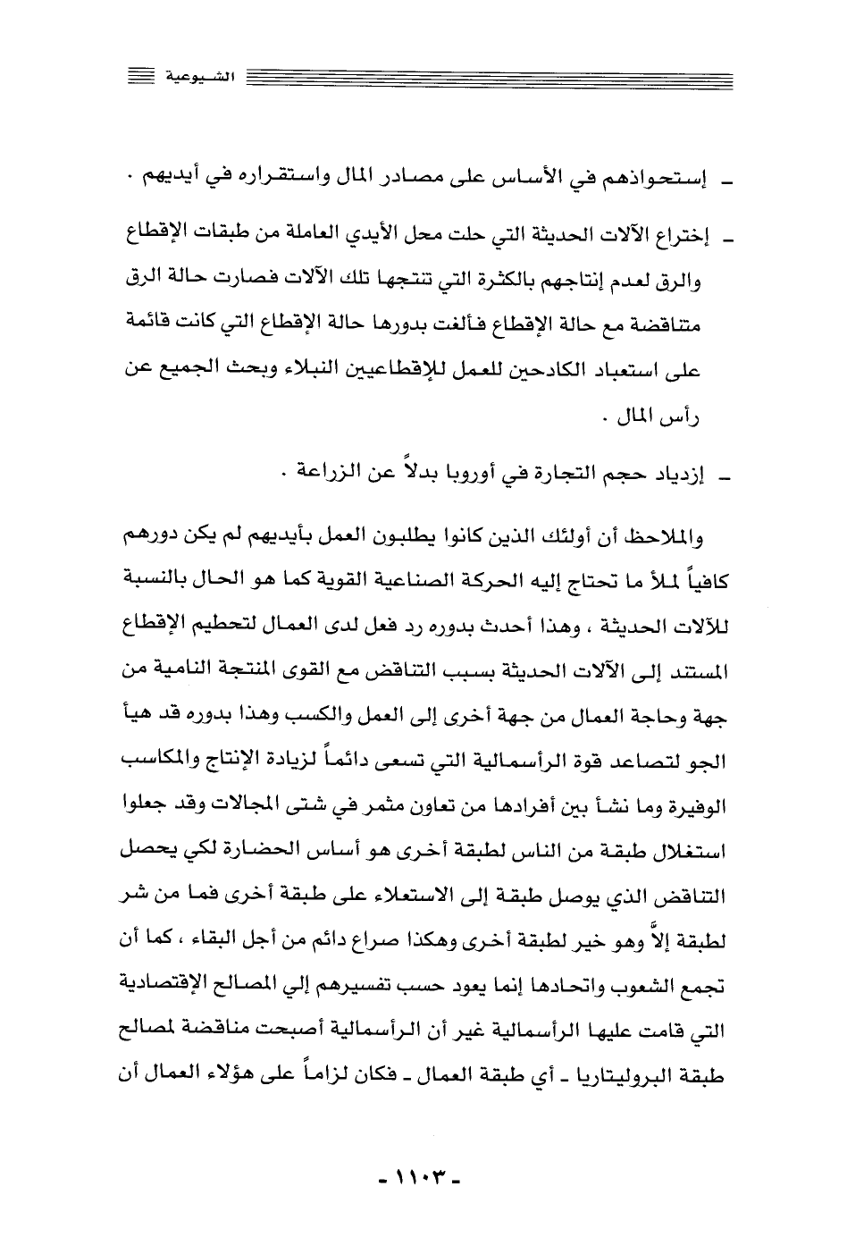 والملاحظ أن أولئك الذين كانوا يطلبون العمل بأيديهم لم يكن دورهم كافيًا لملأ ما تحتاج إليه الحركة الصناعية القوية كما هو الحال بالنسبة للآلات الحديثة، وهذا أحدث بدوره ردَّ فعل لدى العمال لتحطيم الإقطاع المستند إلى الآلات الحديثة؛ بسبب التناقض مع القوى المنتجة النامية من جهة, وحاجة العمَّال من جهة أخرى إلى العمل والكسب, وهذا بدروه قد هيَّأ الجو لتصاعد قوة الرأسمالية التي تسعى دائمًا لزيادة الإنتاج والمكاسب الوفيرة, وما نشأ بين أفرادها من تعاونٍ مثمر في شتَّى المجالات, وقد جعلوا استغلال طبقة من الناس لطبقة أخرى هو أساس الحضارة لكي يحصل التناقض الذي يوصل طبقة إلى الاستعلاء على طبقة أخرى, فما من شر لطبقة إلّا وهو خير لطبقة أخرى, وهكذا صراع دائم من أجل البقاء، كما أنَّ تجمع الشعوب واتحادها إنما يعود حسب تفسيرهم إلى المصالح الاقتصادية التي قامت عليها الرأسمالية, غير أن الرأسمالية أصبحت مناقضة لمصالح طبقة البروليتاريا -أي طبقة العمال- فكان لزامًا على هؤلاء العمال أن