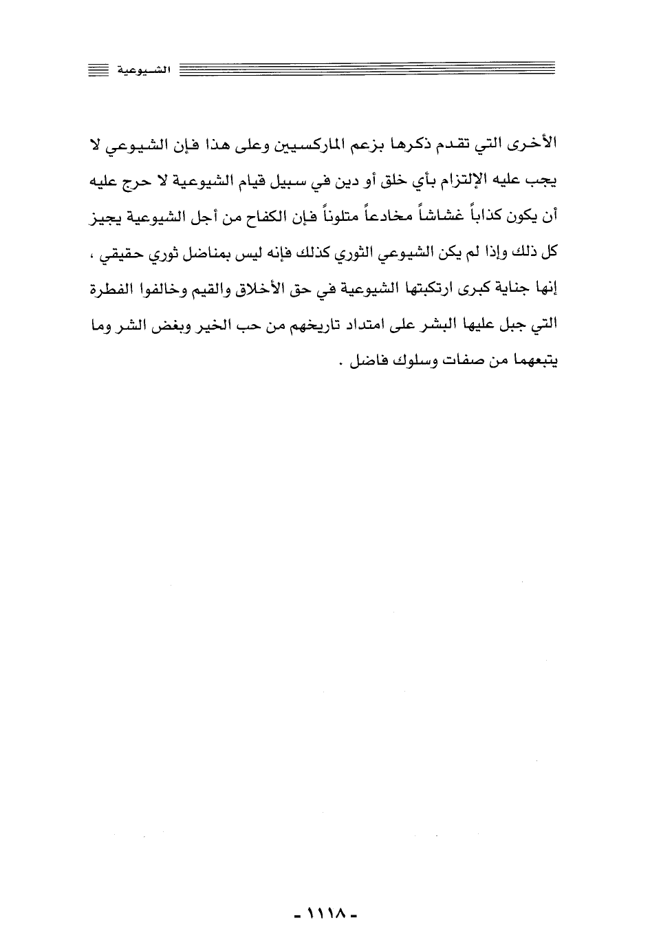 الأخرى التي تقدَّم ذكرها -بزعم الماركسيين, وعلى هذا فإن الشيوعي لا يجب عليه الالتزام بأي خلق أو دين في سبيل قيام الشيوعية, لا حرج عليه أن يكون كذابًا غشاشًا مخادعًا متلونًا, فإن الكفاح من أجل الشيوعية يجيز كل ذلك, وإذا لم يكن الشيوعي الثوريّ كذلك, فإنه ليس بمناضل ثوري حقيقي، إنها جناية كبرى ارتكبتها الشيوعية في حق الأخلاق والقيم, وخالفوا الفطرة التي جُبِلَ عليها البشر على امتداد تاريخهم من حب الخير وبغض الشر, وما يتبعهما من صفات وسلوك فاضل.