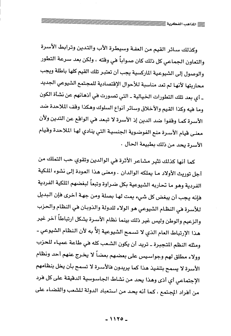 وكذلك سائر القيم من العفَّة وسيطرة الأب والتدين وترابط الأسرة والتعاون الجماعي, كل ذلك كان صوابًا في وقته، ولكن بعد سرعة التطور والوصول إلى الشيوعية الماركسية يجب أن تعتبر تلك القيم كلها باطلة ويجب محاربتها؛ لأنها لم تعد مناسبة للأحوال الاقتصادية للمجتمع الشيوعي الجديد -أي: بعد تلك التطوارت الخيالية- التي تصورت في أذهانهم عن نشأة الكون وما فيه, وكذا القيم والأخلاق وسائر أنواع السلوك, وهكذا وقف الملاحدة ضد الأسرة كما وقفوا ضد الدين؛ إذ الأسرة لا تبعد في الواقع عن التدين؛ ولأن معنى قيام الأسرة منع الفوضوية الجنسية التي ينادي لها الملاحدة, وقيام الأسرة يحد من ذلك بطبيعة الحال.