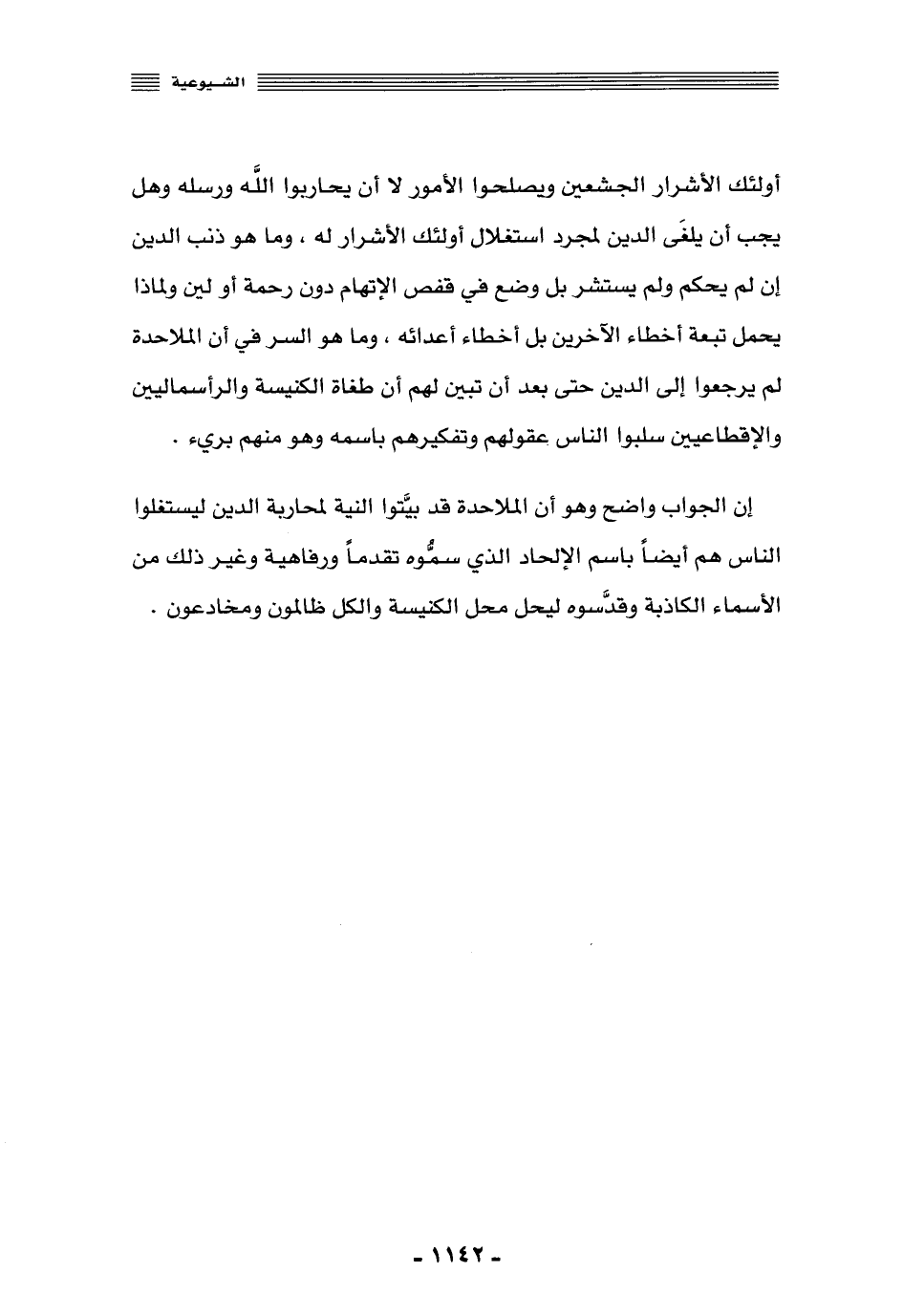 أولئك الأشرار الجشعين, ويصلحوا الأمور, لا أن يحاربوا الله ورسله, وهل يجب أن يلغى الدين لمجرد استغلال أولئك الأشرار له، وما هو ذنب الدين إن لم يحكم ولم يستشر, بل وضع في قفص الاتهام دون رحمة أو لين, ولماذا يحمل تبعة أخطاء الآخرين بل أخطاء أعدائه، وما هو السر في أن الملاحدة لم يرجعوا إلى الدين حتى بعد أن تبيَّن لهم أن طغاة الكنيسة والرأسماليين والإقطاعيين سلبوا الناس عقولهم وتفكيرهم باسمه وهو منهم برئ.