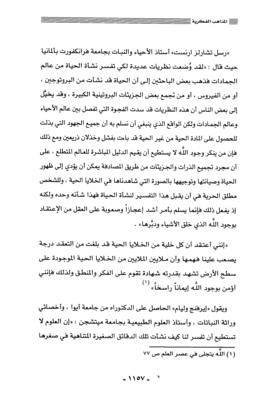 "رسل تشارلز أرنست" أستاذ الأحياء والنبات بجامعة فرانفكورت بألمانيا؛ حيث قال: "لقد وضعت نظريات عددية لكي تفسّر نشأة الحياة من عالم الجمادات, فذهب بعض الباحثين إلى أن الحيَّة قد نشأت من البروتوجين، أو من الفيروس، أو من تجمُّع بعض الجزيئيات البروتينية الكبيرة, وقد يخيل إلى بعض الناس أن هذه النظريات فد سدَّت الفجوة التي تفصل بين عالم الأحياء وعالم الجمادات, ولكن الواقع الذي ينبغي أن نسلِّم به أن جميع الجهود التي بذلت للحصول على المادة الحية من غير الحية قد باءت بفشل وخذلان ذريعين, ومع ذلك فإنَّ من ينكر وجود الله لا يستطيع أن يقيم الدليل المباشرة للعالم المتطلع، على أن مجرَّد تجميع الذرات والجزيئات من طريق المصادفة يمكن أن يؤدي إلى ظهور الحياة وصيانتها وتوجيهها بالصورة التي شاهدناها في الخلايا الحية، وللشخص مطلق الحرية في أن يقبل هذا التفسير لنشأة الحياة, فهذا شأنه وحده, ولكنه إذ يفعل ذلك فإنما يسلِّم بأمر أشدَّ إعجازًا وصعوبة على العقل من الاعتقاد بوجود الله الذي خلق الأشياء ودبرها".