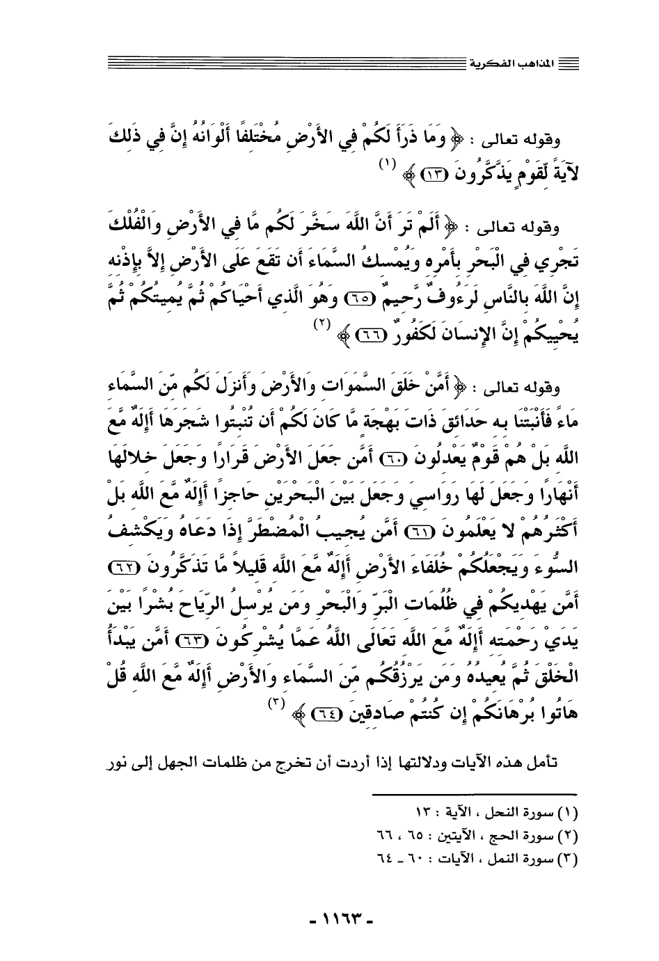 وقوله تعالى: {أَمَّنْ خَلَقَ السَّمَاوَاتِ وَالْأَرْضَ وَأَنْزَلَ لَكُمْ مِنَ السَّمَاءِ مَاءً فَأَنْبَتْنَا بِهِ حَدَائِقَ ذَاتَ بَهْجَةٍ مَا كَانَ لَكُمْ أَنْ تُنْبِتُوا شَجَرَهَا أَئِلَهٌ مَعَ اللَّهِ بَلْ هُمْ قَوْمٌ يَعْدِلُونَ، أَمَّنْ جَعَلَ الْأَرْضَ قَرَارًا وَجَعَلَ خِلَالَهَا أَنْهَارًا وَجَعَلَ لَهَا رَوَاسِيَ وَجَعَلَ بَيْنَ الْبَحْرَيْنِ حَاجِزًا أَئِلَهٌ مَعَ اللَّهِ بَلْ أَكْثَرُهُمْ لَا يَعْلَمُونَ، أَمَّنْ يُجِيبُ الْمُضْطَرَّ إِذَا دَعَاهُ وَيَكْشِفُ السُّوءَ وَيَجْعَلُكُمْ خُلَفَاءَ الْأَرْضِ أَئِلَهٌ مَعَ اللَّهِ قَلِيلًا مَا تَذَكَّرُونَ، أَمَّنْ يَهْدِيكُمْ فِي ظُلُمَاتِ الْبَرِّ وَالْبَحْرِ وَمَنْ يُرْسِلُ الرِّيَاحَ بُشْرًا بَيْنَ يَدَيْ رَحْمَتِهِ أَئِلَهٌ مَعَ اللَّهِ تَعَالَى اللَّهُ عَمَّا يُشْرِكُونَ، أَمَّنْ يَبْدَأُ الْخَلْقَ ثُمَّ يُعِيدُهُ وَمَنْ يَرْزُقُكُمْ مِنَ السَّمَاءِ وَالْأَرْضِ أَئِلَهٌ مَعَ اللَّهِ قُلْ هَاتُوا بُرْهَانَكُمْ إِنْ كُنْتُمْ صَادِقِينَ} 3.