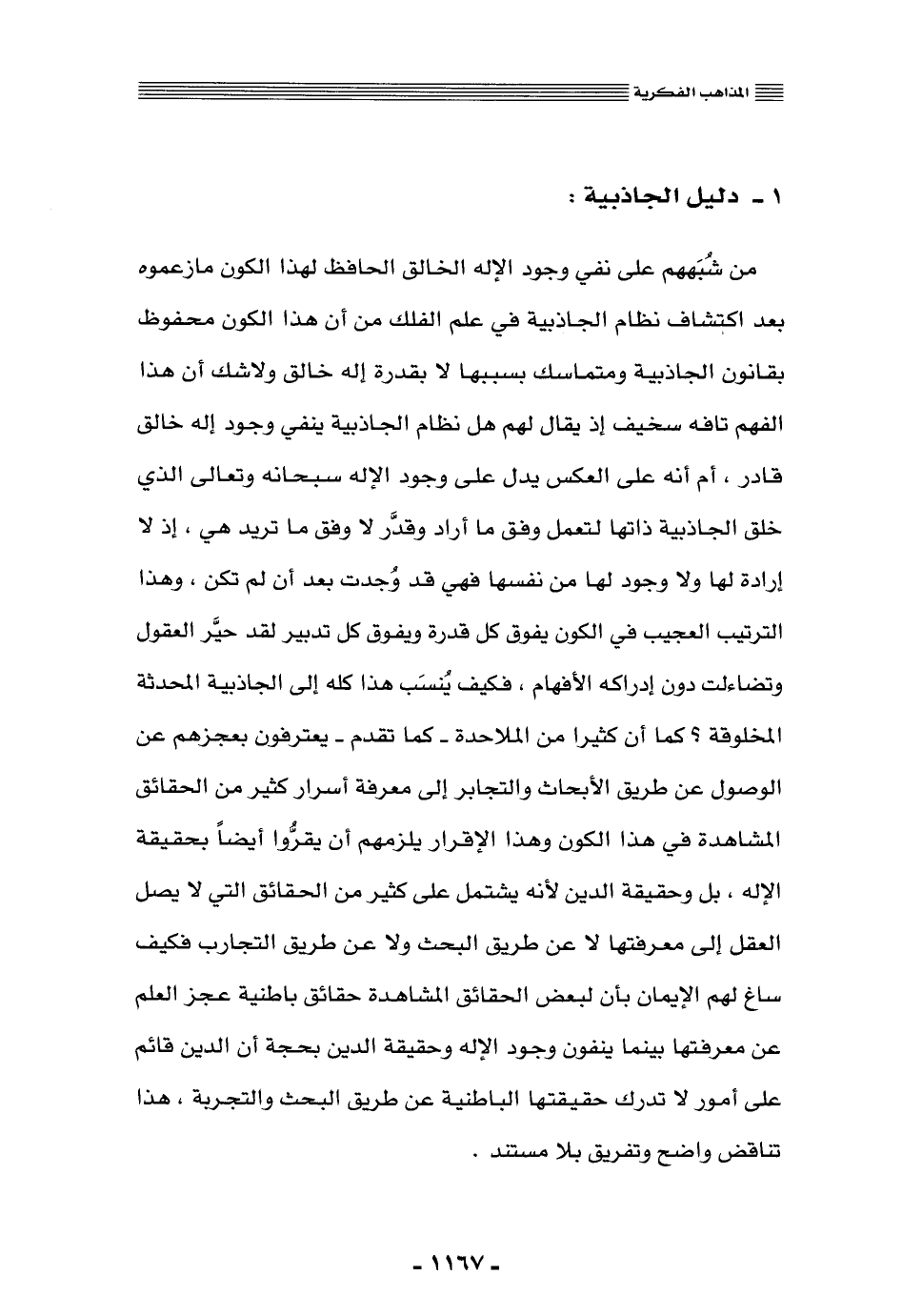 من شبههم على نفي وجود الإله الخالق والحافظ لهذا الكون ما زعموه بعد اكتشاف نظام الجاذبية في علم الفلك من أنَّ هذا الكون محفوظ بقانون الجاذبية ومتماسك بسببها لا بقدرة إله خالق, ولا شك أن هذا الفهم تافه سخيف؛ إذ يقال لهم: هل نظام الجاذبية ينفي وجود إله خالق قادر، أم أنه على العكس يدل على وجود الإله -سبحانه وتعالى- الذي خلق الجاذبية ذاتها؛ لتعمل وفق ما أراد وقدَّر لا وفق ما تريد هي؛ إذ لا إرادة لها ولا وجود لها من نفسها, فهي قد وجدت بعد أن لم تكن، وهذا الترتيب العجيب في الكون يفوق كل قدرة, ويفوق كل تدبير, لقد حيَّر العقول وتضاءلت دون إدراكه الأفهام، فكيف ينسب هذا كله إلى الجاذبية المحدثة المخلوقة؟ كما أن كثيرًا من الملاحدة -كما تقدَّم- يعترفون بعجزهم عن الوصول عن طريق الأبحاث والتجارب إلى معرفة أسرار كثير من الحقائق المشاهدة في هذا الكون, وهذا الإقرار يلزمهم أن يقروا أيضًا بحقيقة الإله، بل وحقيقة الدين؛ لأنه يشتمل على كثير من الحقائق التي لا يصل العقل إلى معرفتها لا عن طريق البحث ولا عن طريق التجارب, فكيف ساغ لهم الإيمان بأن لبعض الحقائق المشاهدة حقائق باطنية عجز العلم عن معرفتها, بينهما ينفون وجود الإله وحقيقة الدين؛ بحجة أن الدين قائم على أمور لا تدرك حقيقتها الباطنية عن طريق البحث والتجربة، هذا تناقض واضح وتفريق بلا مستند.