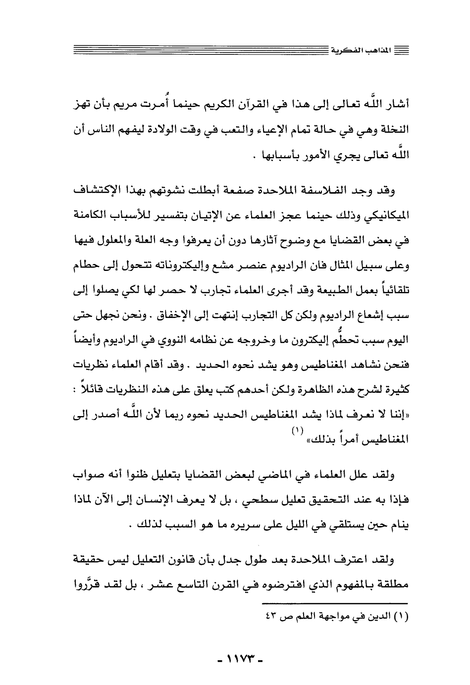 وقد وجد الفلاسفة الملاحدة صفعة أبطلت نشوتهم بهذا الاكتشاف الميكانيكي, وذلك حينما عجز العلماء عن الإتيان بتفسير للأسباب الكامنة في بعض القضايا مع وضوح آثارها, دون أن يعرفوا وجه العلة والمعلول فيها, وعلى سبيل المثال: فإن الراديوم عنصر مشع وإليكترواناته تتحوّل إلى حطام تلقائيًّا بعمل الطبيعة, وقد أجرى العلماء تجارب لا حصر لها لكي يصلوا إلى سبب إشعاع الراديوم, ولكن كل التجارب انتهت إلى الإخفاق، ونحن نجهل حتى اليوم سبب تحطُّم إليكترون ما وخروجه عن نظامه النووي في الراديوم, وأيضًا فنحن نشاهد المغناطيس وهو يشد نحوه الحديد، وقد أقام العلماء نظريات كثيرة لشرح هذه الظاهرة, ولكن أحدهم كتب يعلق على هذه النظريات قائلًا: "إننا لا نعرف لماذا يشد المغناطيس الحديد نحوه, ربما لأنَّ الله أصدر إلى المغناطيس أمرًا بذلك"1.