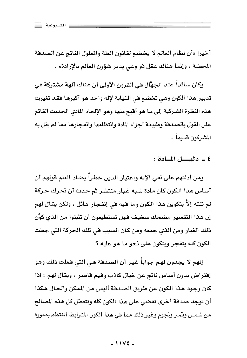 أخيرًا "أن نظام العالم لا يخضع لقانون العلة والمعلول الناتج عن الصدفة المحضة, وإنما هناك عقل ذو وعي يدبر شئون العالم بالإرادة".