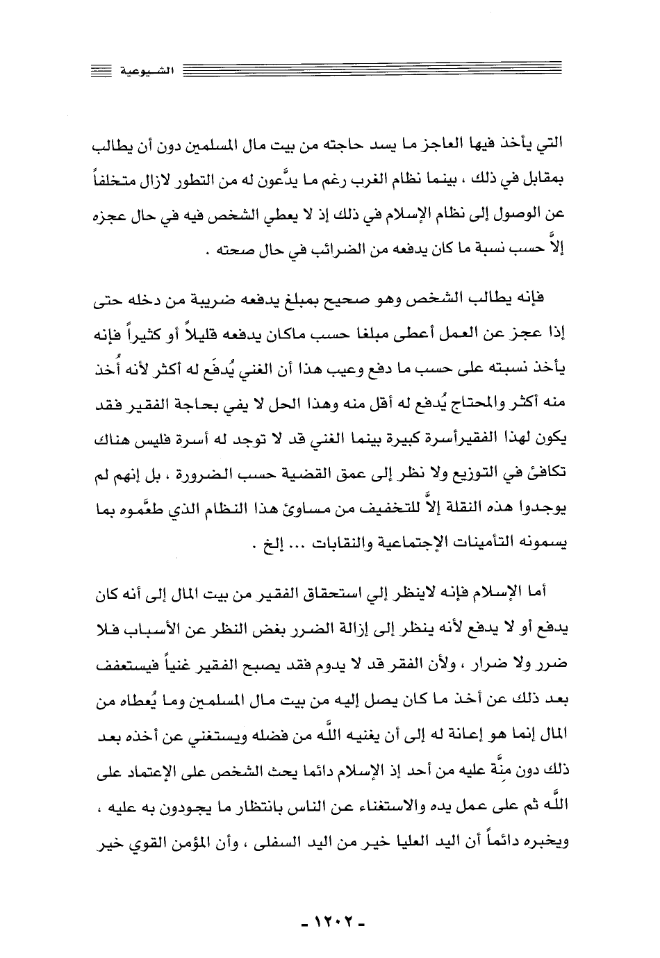 التي يأخذ فيها العاجز ما يسد حاجته من بيت مال المسلمين دون أن يطالب بمقابل في ذلك، بينما نظام الغرب رغم ما يدعون له من التطور لازال متخلفًا عن الوصول إلى نظام الإسلام في ذلك؛ إذ لا يعطي الشخص فيه في حال عجزه إلّا حسب نسبة ما كان يدفعه من الضرائب في حال صحته.