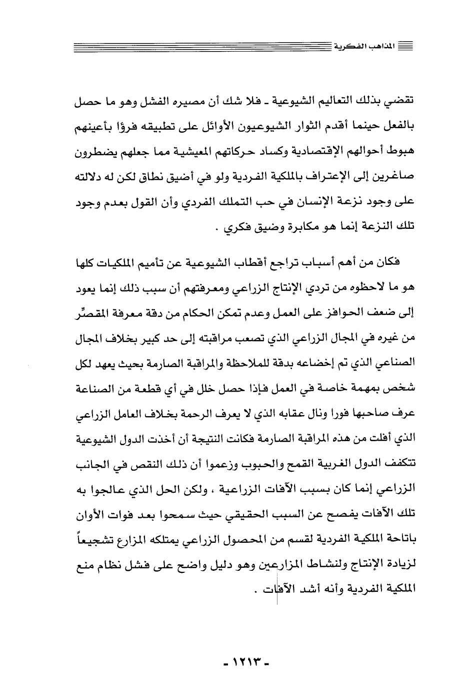 فكان من أهم أسباب تراجع أقطاب الشيوعية عن تأميم الملكيات كلها, هو ما لاحظوه من تردي الإنتاج الزراعي, ومعرفتهم أن سبب ذلك إنما يعود إلى ضعف الحوافز على العمل, وعدم تمكُّن الحكام من دقة معرفة المقصِّر من غيره في المجال الزراعي الذي تصعب مراقبته إلى حدٍّ كبير, بخلاف المجال الصناعي الذي تَمَّ إخضاعه بدقة للملاحظة والمراقبة الصارمة؛ بحيث يعهد لكل شخص بمهمة خاصة في العمل, فإذا حصل خلل في أي قطعة من الصناعة عرف صاحبها فورًا ونال عقابه الذي لا يعرف الرحمة, بخلاف العامل الزراعي الذي أفلت من هذه المراقبة الصارمة, فكانت النتيجة أن أخذت الدول الشيوعية تتكفَّف الدول الغربية القمح والحبوب, وزعموا أن ذلك النقص في الجانب الزراعي إنما كان بسبب الآفات الزراعية، ولكن الحلَّ الذي عالجوا به تلك الآفات يفصح عن السبب الحقيقي؛ حيث سمحوا بعد فوات الأوان بإتاحة الملكية الفردية لقسم من المحصول الرزاعي يمتلكه المزارع تشجيعًا لزيادة الإنتاج ولنشاط المزراعين, وهو دليل واضح على فشل نظام منع الملكية الفردية, وأنه أشد الآفات.