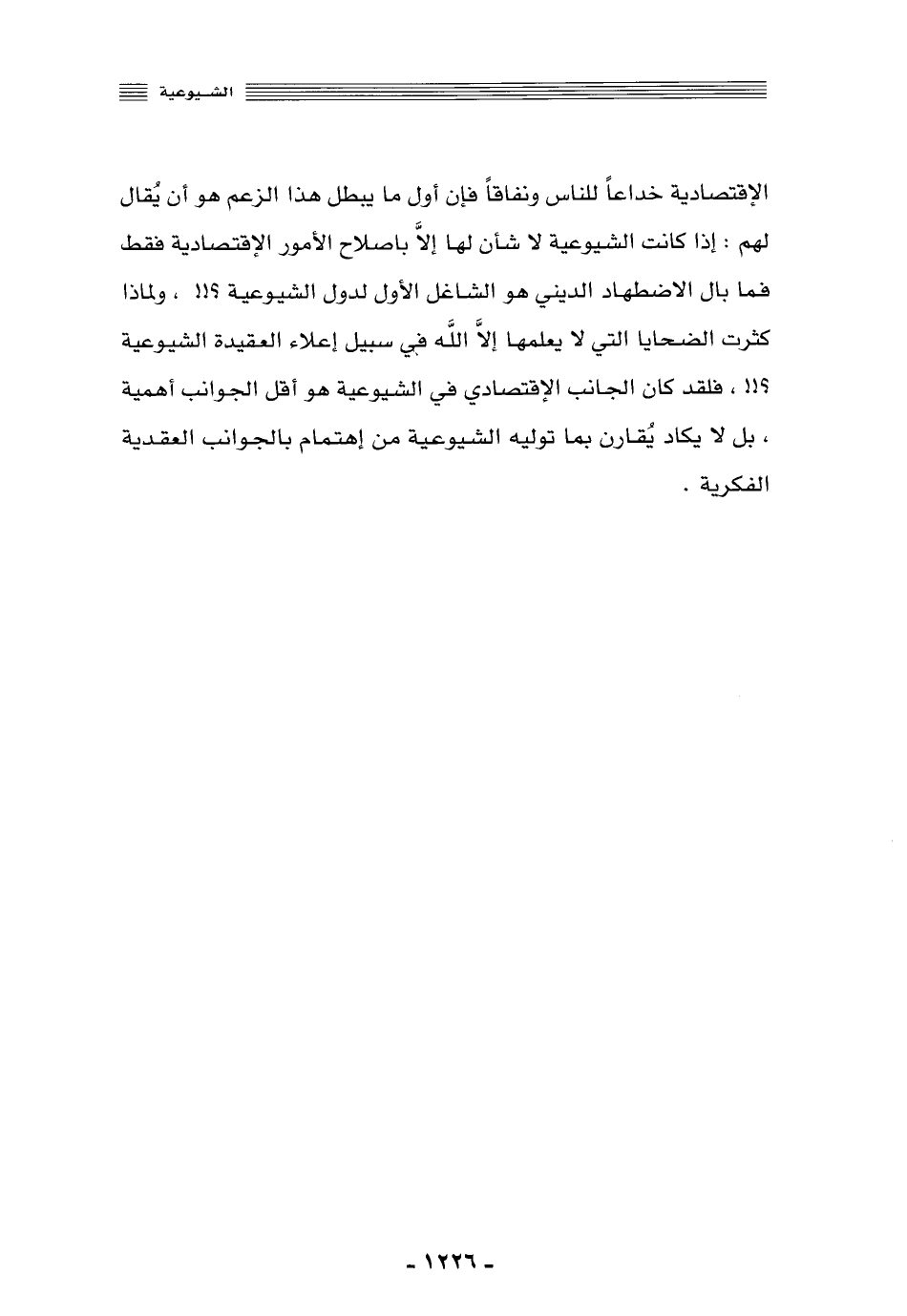 الاقتصادية خداعًا للناس ونفاقًا, فإن أول ما يبطل هذا الزعم هو أن يقال لهم: إذا كانت الشيوعية لا شأن لها إلّا بإصلاح الأمور الاقتصادية فقط, فما بال الاضطهاد الديني هو الشاغل الأول لدول الشيوعية؟ ولماذا كثرت الضحايا التي لا يعلمها إلّا الله في سبيل إعلاء العقيدة الشيوعية؟ فلقد كان الجانب الاقتصادي في الشيوعية هو أقلّ الجوانب أهميةً، بل لا يكاد يقارن بما توليه الشيوعية من اهتمام بالجوانب العقدية الفكرية.