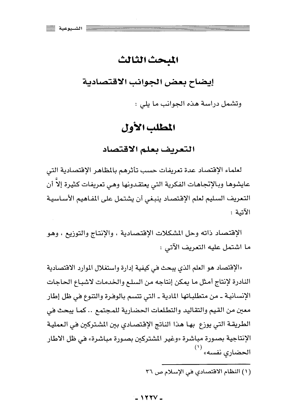 "الاقتصاد هو العلم الذي يبحث في كيفية إدارة واستغلال الموارد الاقتصادية النادرة لإنتاج أمثل ما يمكن إنتاجه من السلع والخدمات لإشباع الحاجات الإنسانية -من متطلباتها المادية- التي تتسم بالوفرة والتنوّع في ظل إطارٍ معينٍ من القيم والتقاليد والتطلعات الحضارية للمجتمع.. كما يبحث في الطريقة التي يوزَّع بها هذا الناتج الاقتصادي بين المشتركين في العملية الإنتاجية بصورة مباشرة "وغير المشركين بصورة مباشرة" في ظل الإطار الحضاري نفسه"1.
