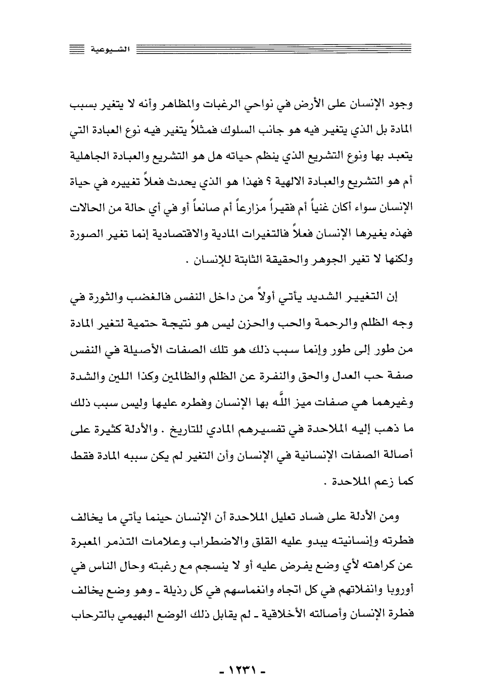 وجود الإنسان على الأرض في نواحي الرغبات والمظاهر, وأنه لا يتغير بسبب المادة, بل الذي يتغيّر فيه هو جانب السلوك, فمثلًا يتغيِّر فيه نوع العبادة التي يتعبَّد بها ونوع التشريع الذي ينظم حياته, هل هو التشريع والعبادة الجاهلية؟ أم هو التشريع والعبادة الإلهية؟ فهذا هو الذي يحدث فعلًا تغييره في حياة الإنسان, سواء أكان غنيًّا أم فقيرًا, مزارعًا أم صانعًا, أو في أي حالة من الحالات, فهذه يغيرها الإنسان فعلًا؛ فالتغيرات المادية والاقتصادية إنما تغيّر الصورة ولكنها لا تغير الجوهر والحقيقة الثابتة للإنسان.