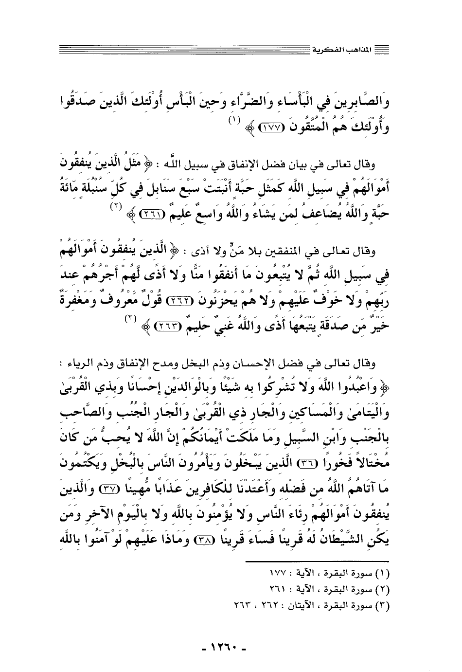وقال تعالى في المنفقين بلا مَنٍّ ولا أذى: {الَّذِينَ يُنْفِقُونَ أَمْوَالَهُمْ فِي سَبِيلِ اللَّهِ ثُمَّ لَا يُتْبِعُونَ مَا أَنْفَقُوا مَنًّا وَلَا أَذًى لَهُمْ أَجْرُهُمْ عِنْدَ رَبِّهِمْ وَلَا خَوْفٌ عَلَيْهِمْ وَلَا هُمْ يَحْزَنُونَ، قَوْلٌ مَعْرُوفٌ وَمَغْفِرَةٌ خَيْرٌ مِنْ صَدَقَةٍ يَتْبَعُهَا أَذًى وَاللَّهُ غَنِيٌّ حَلِيمٌ} 3.