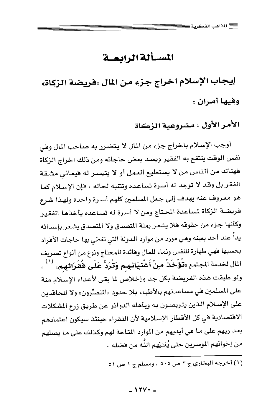 المسألة الرابعة: إيجاب الإسلام إخراج جزء من المال "فريضة الزكاة"