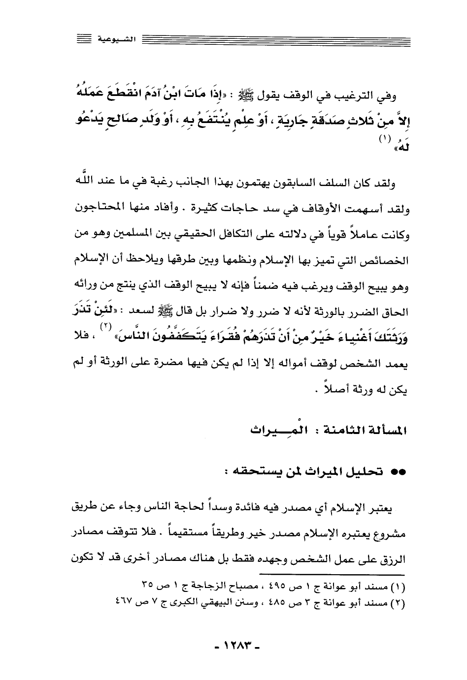 ولقد كان السلف السابقون يهتمّون بهذا الجانب رغبةً في ما عند الله, ولقد أسهمت الأوقاف في سد حاجات كثيرة، وأفاد منها المحتاجون, وكانت عاملًا قويًّا في دلالته على التكافل الحقيقي بين المسلمين, وهو من الخصائص التي تميِّز بها الإسلام, ونظَّمها وبيِّنَ طرقها, ويلاحظ أن الإسلام وهو يبيح الوقف ويرغِّب فيه ضمانًا, فإنه لا يبيح الوقف الذي ينتج من ورائه إلحاق الضرر بالورثة؛ لأنه لا ضرر ولا ضرار, بل قال صلى الله عليه وسلم لسعد: "لئن تذر ورثتك أغنياء خير من أن تذرهم فقراء يتكفَّفون الناس" 2، فلا يعمد الشخص لوقف أمواله إلّا إذا لم يكن فيها مضرَّة على الورثة, أو لم يكن له ورثة أصلًا.