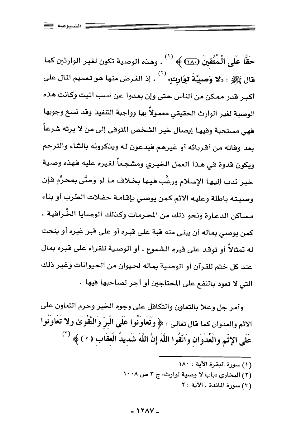 حَقًّا عَلَى الْمُتَّقِينَ} 1، وهذه الوصية تكون لغير الوراثين كما قال صلى الله عليه وسلم: "لا وصية لوارث" 2، إذ الغرض منها هو تعميم المال على أكبر قدر ممكن من الناس, حتى وإن بعدوا عن نسب الميت, وكانت هذه الوصية لغير الوارث الحقيقي معمولًا بها وواجبة التنفيذ, وقد نسخ وجوبها فهي مستحبَّة, وفيها إيصال خير الشخص المتوفى إلى من لا يرثه شرعًا بعد وفاته من أقربائه أو غيرهم فيدعون له, ويذكرونه بالثناء والترحم, ويكون قدوة في هذا العمل الخيري ومشجعًا لغيره عليه, فهذه الوصية خير نَدَبَ إليها الإسلام ورغَّب فيها, بخلاف ما لو وصَّى بمحرَّم, فإن وصيته باطلة وعليه الإثم كمن يوصي بإقامة حفلات الطرب, وبناء مساكن الدعارة, ونحو ذلك من المحرَّمات, وكذلك الوصايا الخرافية، كمن يوصي بماله أن يبنى منه قبَّة على قبره, أو على قبر غيره, أو ينحت له تمثالًا, أو توقد على قبره الشموع، أو الوصية للقراء على قبره بمال عند كل ختم للقرآن, أو الوصية بماله لحيّان من الحيوانات, وغير ذلك, التي لا تعود بالنفع على المحتاجين أو أجر لصاحبها فيها.