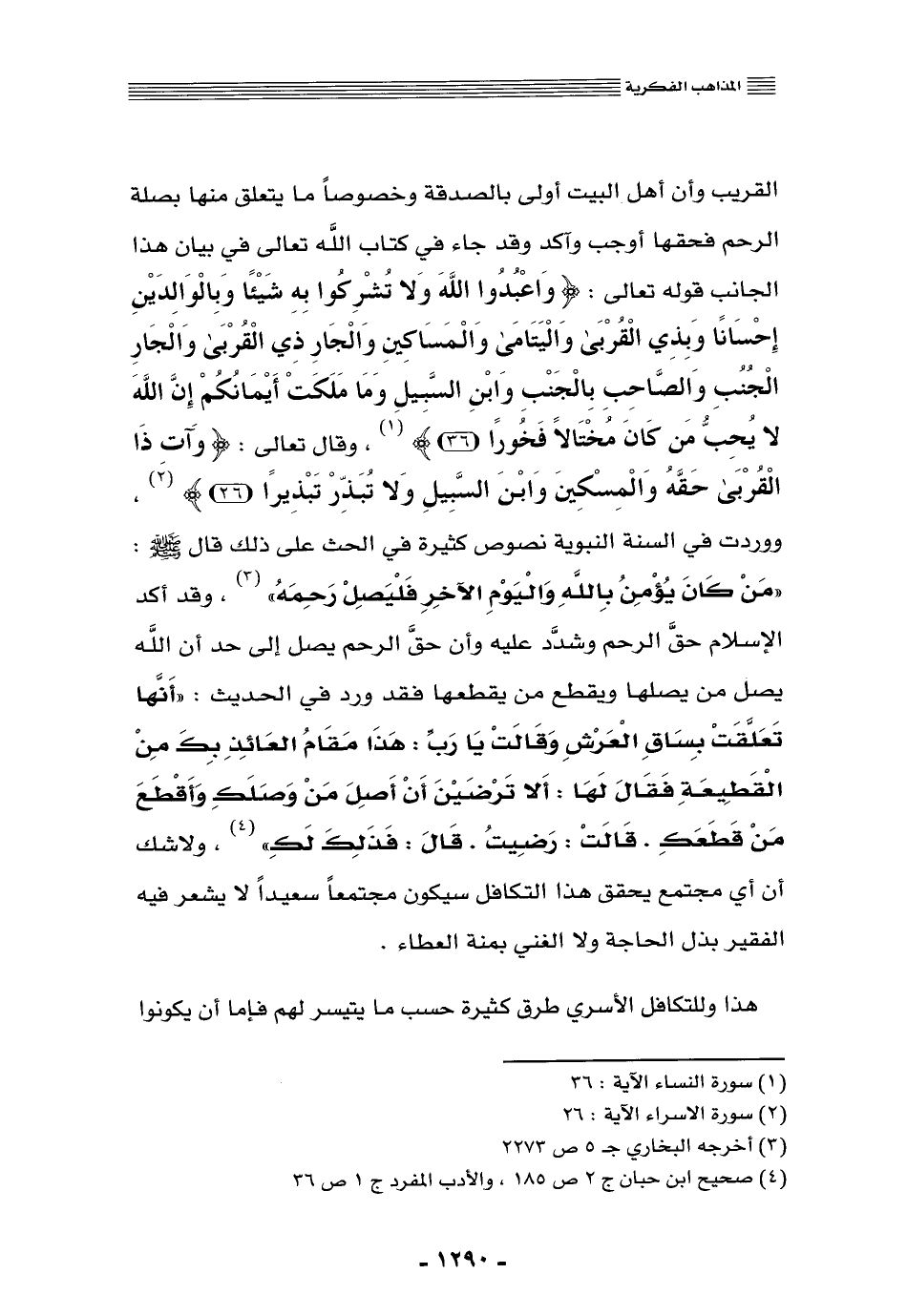 القريب, وأن أهل البيت أولى بالصدقة, وخصوصًا ما يتعلق منها بصلة الرحم, فحقها أوجب وآكد, وقد جاء في كتاب الله تعالى في بيان هذا الجانب قوله تعالى: {وَاعْبُدُوا اللَّهَ وَلا تُشْرِكُوا بِهِ شَيْئًا وَبِالْوَالِدَيْنِ إِحْسَانًا وَبِذِي الْقُرْبَى وَالْيَتَامَى وَالْمَسَاكِينِ وَالْجَارِ ذِي الْقُرْبَى وَالْجَارِ الْجُنُبِ وَالصَّاحِبِ بِالْجَنْبِ وَابْنِ السَّبِيلِ وَمَا مَلَكَتْ أَيْمَانُكُمْ إِنَّ اللَّهَ لَا يُحِبُّ مَنْ كَانَ مُخْتَالًا فَخُورًا} 1، وقال تعالى: {وَآتِ ذَا الْقُرْبَى حَقَّهُ وَالْمِسْكِينَ وَابْنَ السَّبِيلِ وَلا تُبَذِّرْ تَبْذِيرًا} 2، ووردت في السنة النبوية نصوص كثيرة في الحثّ على ذلك, قال صلى الله عليه وسلم: "من كان يؤمن بالله واليوم الآخر فليصل رحمه" 3، وقد أكد الإسلام حقَّ الرحم وشدَّد عليه, وأن حقَّ الرحم يصل إلى حد أن الله يصل من يصلها, ويقطع من يقطعه, فقد ورد في الحديث: "إنها تعلقت بساق العرش وقالت يا رب: هذا مقام العائذ بك من القطيعة, فقال لها: ألا ترضين أن أصل من وصلك, وأقطع من قطعك، قالت: رضيت، قال: فذلك لك" 4، ولا شكَّ أن أي مجتمع يحقق هذا التكافل سيكون مجتمعًا سعيدًا لا يشعر فيه الفقير بذل الحاجة ولا الغني بمنَّة العطاء.