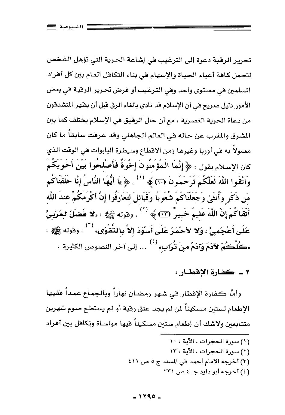 تحرير الرقبة دعوة إلى الترغيب في إشاعة الحرية التي تؤهل الشخص لتحمّل كافّة أعباء الحياة, والإسهام في بناء التكافل العام بين كل أفراد المسلمين في مستوى واحد, وفي الترغيب أو فرض تحرير الرقبة في بعض الأمور دليل صريح في أن الإسلام قد نادى بالغاء الرق قبل أن يظهر المتشدقون من دعاة الحرية العصرية، مع أن حال الرقيق في الإسلام يختلف كما بين المشرق والمغرب عن حاله في العالم الجاهلي, وقد عرفت سابقًا ما كان معمولًا به في أوربا وغيرها زمن الإقطاع, وسيطرة البابوات في الوقت الذي كان الإسلام يقول: {إِنَّمَا الْمُؤْمِنُونَ إِخْوَةٌ فَأَصْلِحُوا بَيْنَ أَخَوَيْكُمْ وَاتَّقُوا اللَّهَ لَعَلَّكُمْ تُرْحَمُونَ} 1، {يَا أَيُّهَا النَّاسُ إِنَّا خَلَقْنَاكُمْ مِنْ ذَكَرٍ وَأُنْثَى وَجَعَلْنَاكُمْ شُعُوبًا وَقَبَائِلَ لِتَعَارَفُوا إِنَّ أَكْرَمَكُمْ عِنْدَ اللَّهِ أَتْقَاكُمْ إِنَّ اللَّهَ عَلِيمٌ خَبِيرٌ} 2، وقوله صلى الله عليه وسلم: "لا فضل لعربي على أعجمي، ولا لأحمر على أسود إلا بالتقوى" 3، وقوله صلى الله عليه وسلم: "كلكم لآدم وآدم من تراب" 4 ... إلى آخر النصوص الكثيرة.