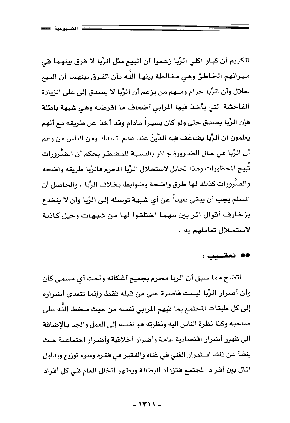 الكريم أن كبار آكلي الربا زعموا أن البيع مثل الربا لا فرق بينهما في ميزانهم الخاطئ, وهي مغالطة بيَّنَها الله بأنَّ الفرق بينهما أن البيع حلال وأن الربا حرام, ومنهم من يزعم أن الربا لا يصدق على الزيادة الفاحشة التي أخذ فيها المرابي أضعاف ما أقرضه وهي شبهة باطلة, فإن الربا يصدق حتى ولو كان يسيرًا ما دام, وقد أخذ عن طريقه مع أنهم يعلمون أن الربا يضاعف فيه الدين عند عدم السداد, ومن الناس من زعم أن الربا في حال الضرورة جائز بالنسبة للمضطر, بحكم أن الضرورات تبيح المحضورات, وهذا تحايل لاستحلال الربا المحرّم, فالربا طريقة واضحة, والضرورات كذلك لها طرق واضحة وضوابط بخلاف الربا. والحاصل أن المسلم يجب أن يبقى بعيدًا عن أي شبهة توصّله إلى الربا, وأن لا ينخدع بزخارف أقوال المرابين مهما اختلقوا لها من شبهات وحيل كاذبة لاستحلال تعاملهم به.