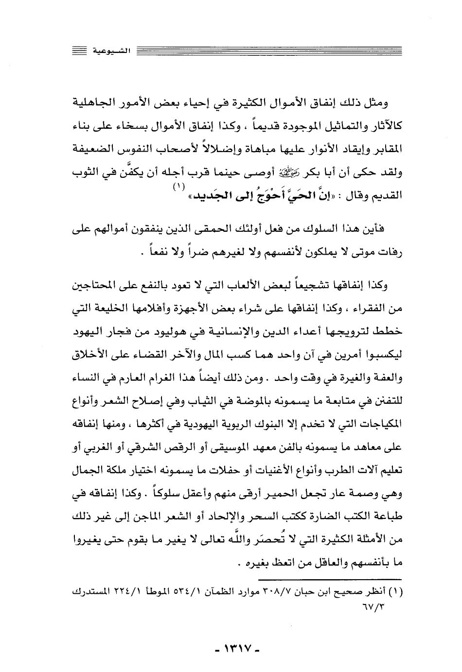 ومثل ذلك إنفاق الأموال الكثيرة في إحياء بعض الأمور الجاهلية؛ كالآثار والتماثيل الموجود قديمًا، وكذ إنفاق الأموال بسخاء على بناء المقابر وإيقاد الأنوار عليها مباهاةً وإضلالًا لأصحاب النفوس الضعيفة, ولقد حكي أن أبا بكر -رضي الله عنه- أوصى حينما قرب أجله أن يكفَّن في الثوب القديم, وقال: "إن الحيَّ أحوج إلى الجديد"1.